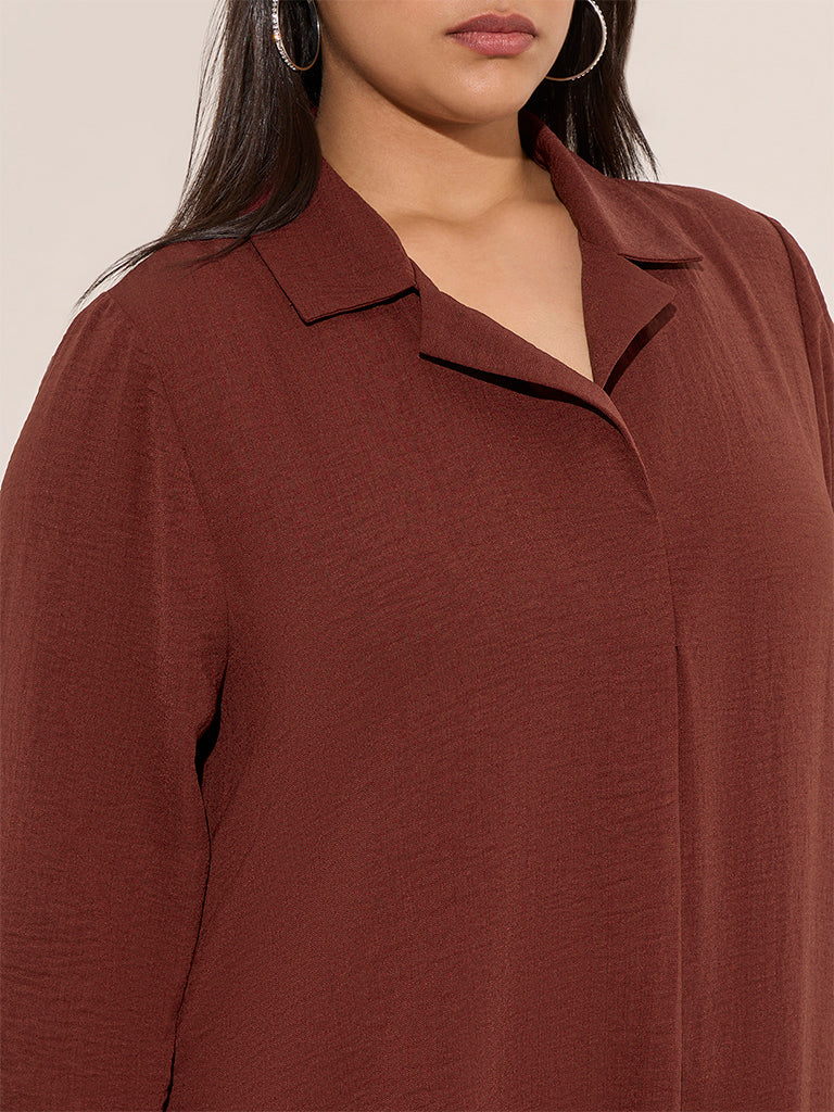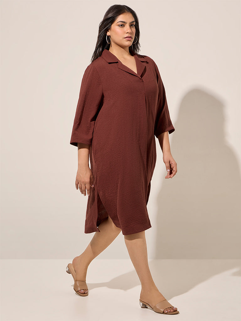 This burgundy shirtdress by Gia is crafted from a crinkle-texture fabric. It boasts a camp collar and three-quarter sleeves.