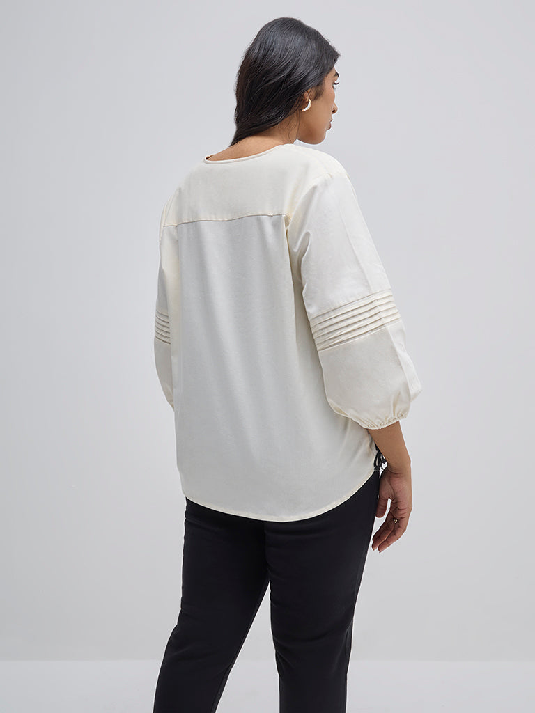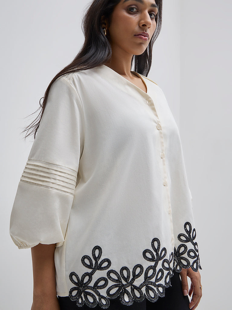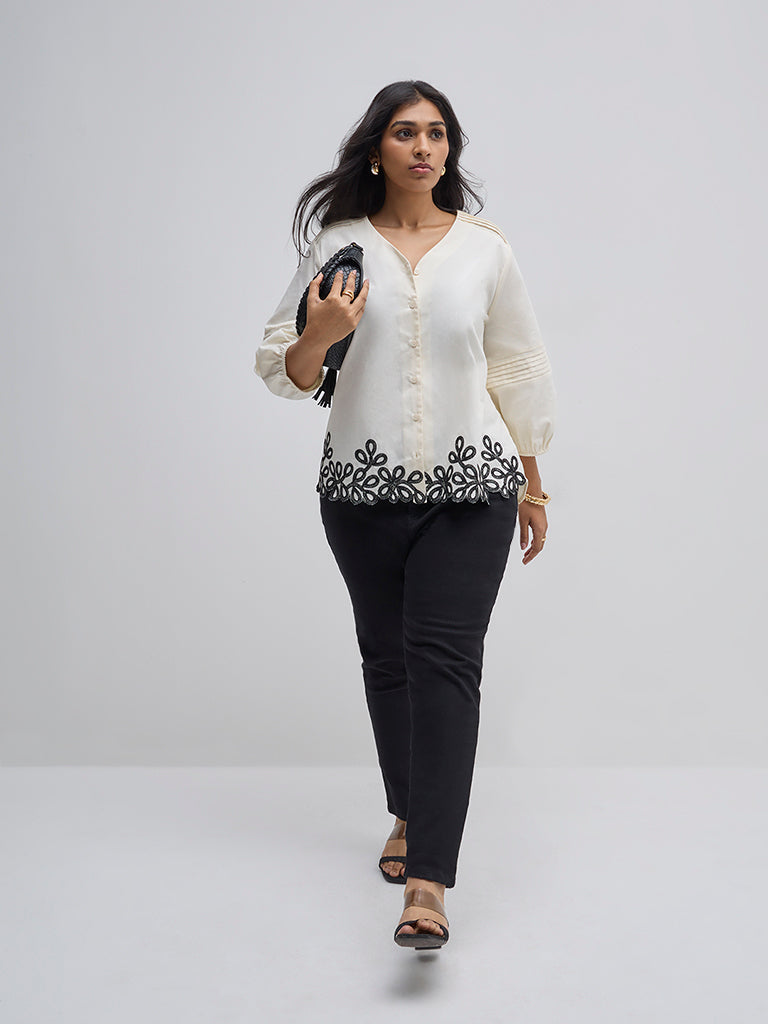 Gia brings you this cream and blouse adorned with black embroidered floral prints and pintuck pleats on the puffed sleeves. Featuring a V-neckline. it has a button placket. its grace is made from a lightweight fabric.
