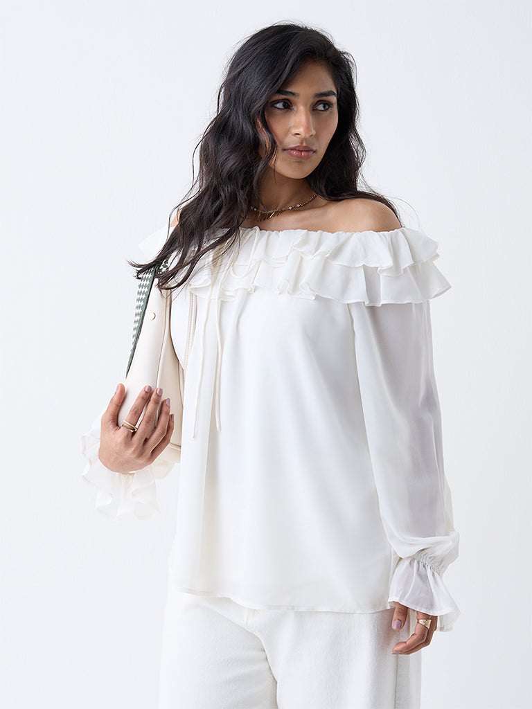 This cream top from Gia is designed with an off-shoulder detail accented by layered ruffles and a drawstring detail. The peasant sleeves feature gathered cuffs that enhance its soft structure. while the lightweight fabric ensures an easy. fluid drape.