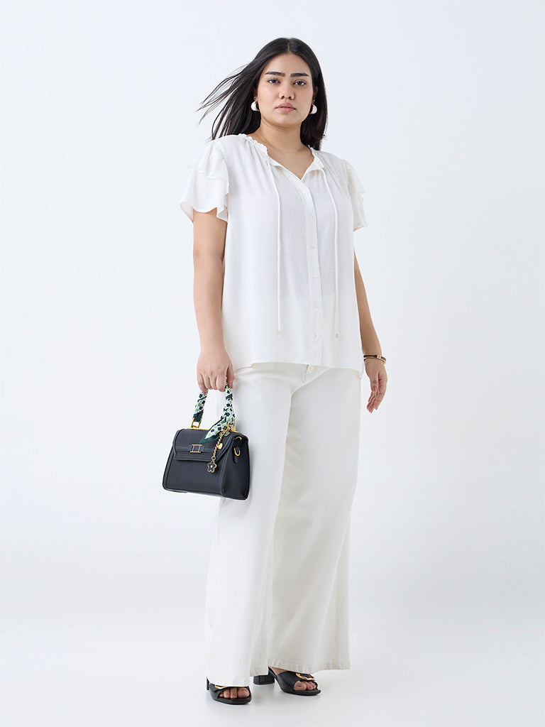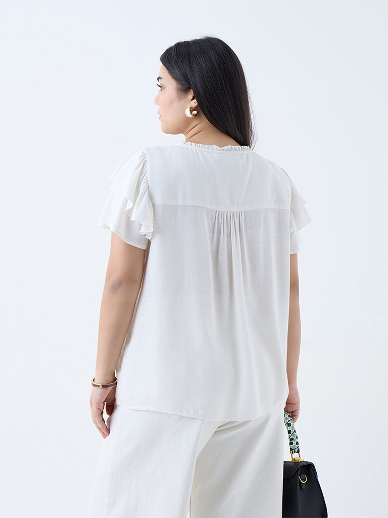 Your everyday outfits just got a chic upgrade with this cream top from Gia. Designed in a solid profile from a super-soft fabric. it carries a split neck with gentle ruching for added charm. The flutter sleeves add a feminine touch. while a button placket lends subtle polish.