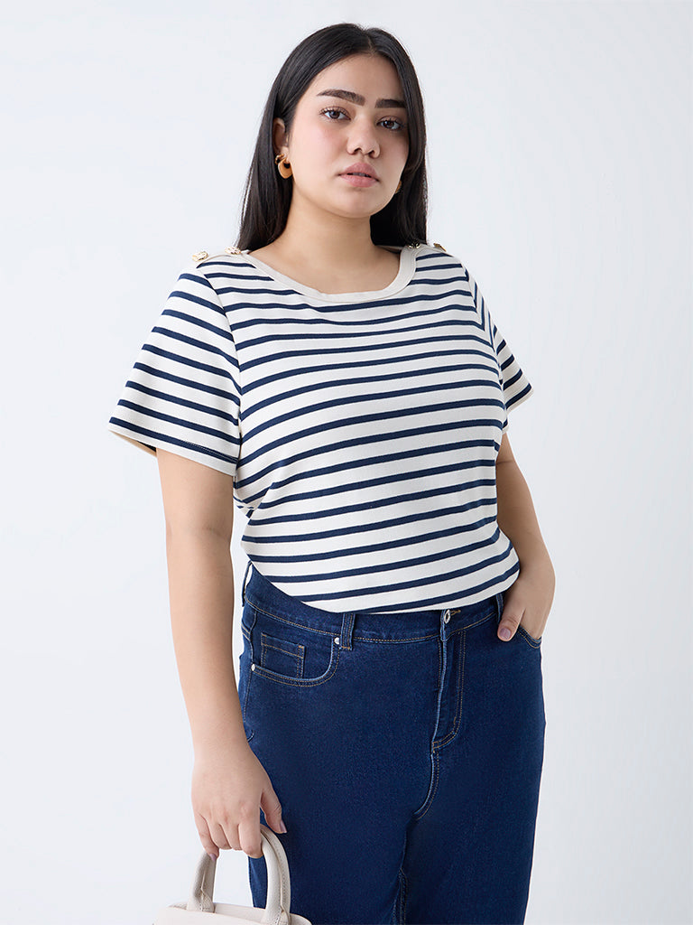 This cream tee from Gia is a go-to piece for relaxed yet thoughtfully curated looks. Adorned with classic stripes and textured buttons along the shoulder. it’s spun from pure cotton. while a crew neck and short sleeves maintain a versatile silhouette.