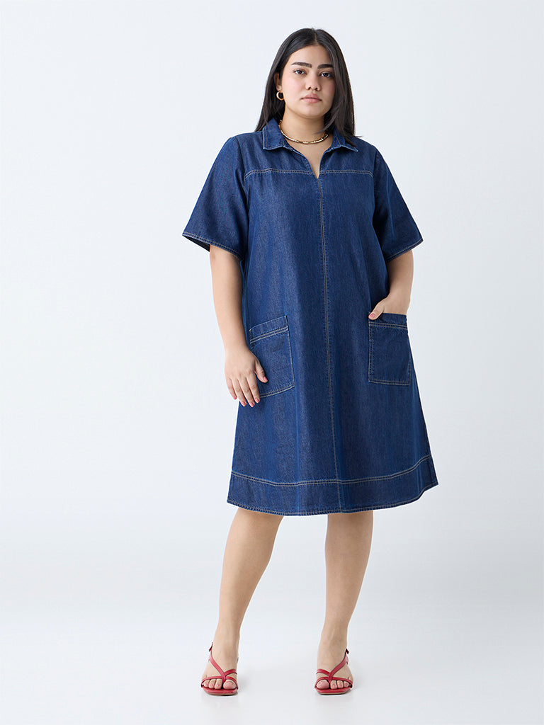 Effortless denim days start with this dark blue dress from Gia. Crafted from a soft cotton-blend material. it’s styled with a V-neck collar. half sleeves and two functional pockets for a look that’s as practical as it is polished.