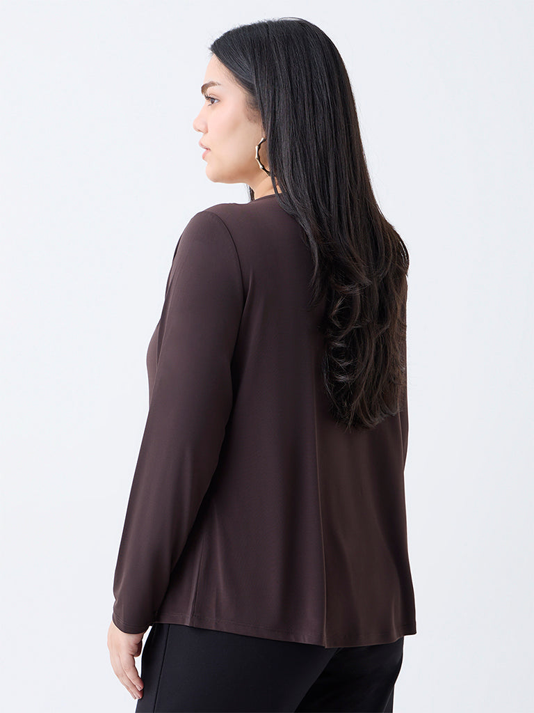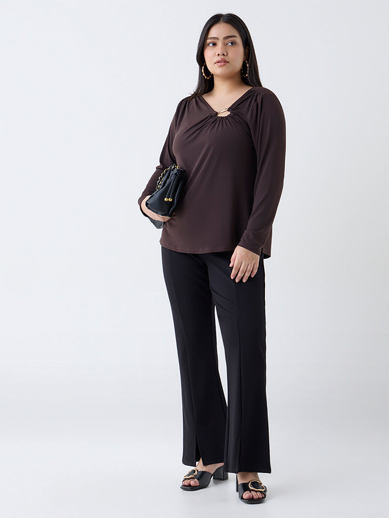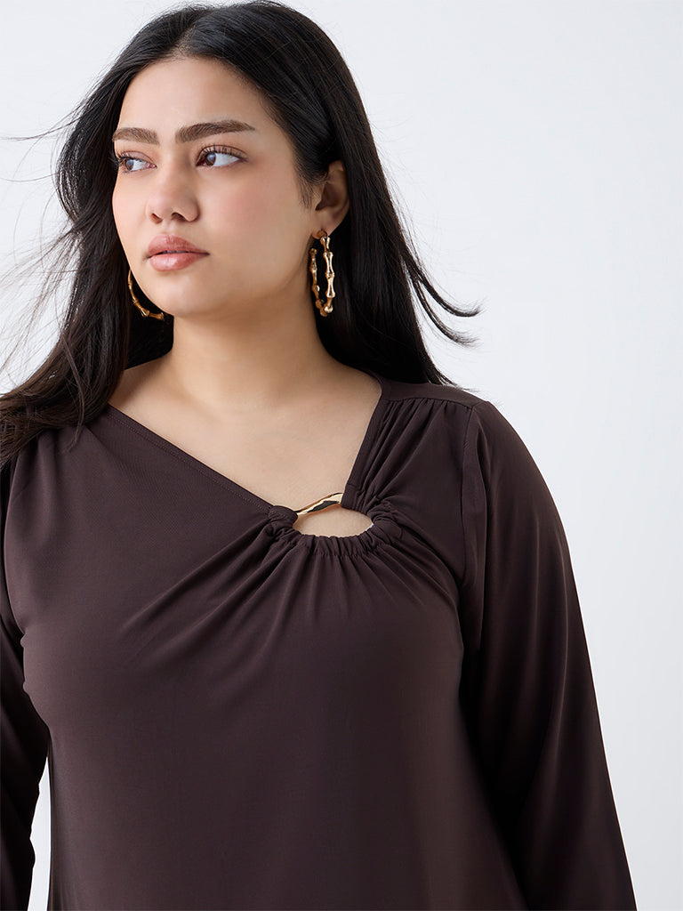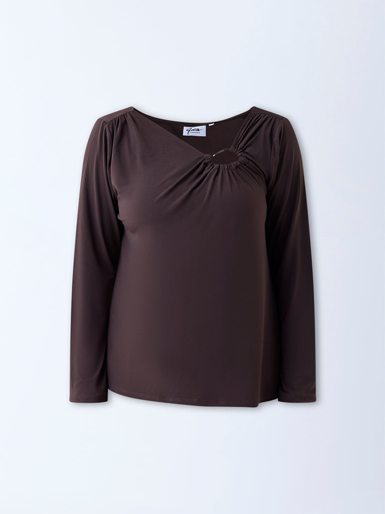 A refined addition to your wardrobe. this dark brown top by Gia is crafted from a stretch-infused fabric that ensures all-day comfort. Designed with a gold-toned hardware and subtle ruching. it lends a touch of sophistication. The full sleeves complete the elegant silhouette. perfect for both work and evening wear.