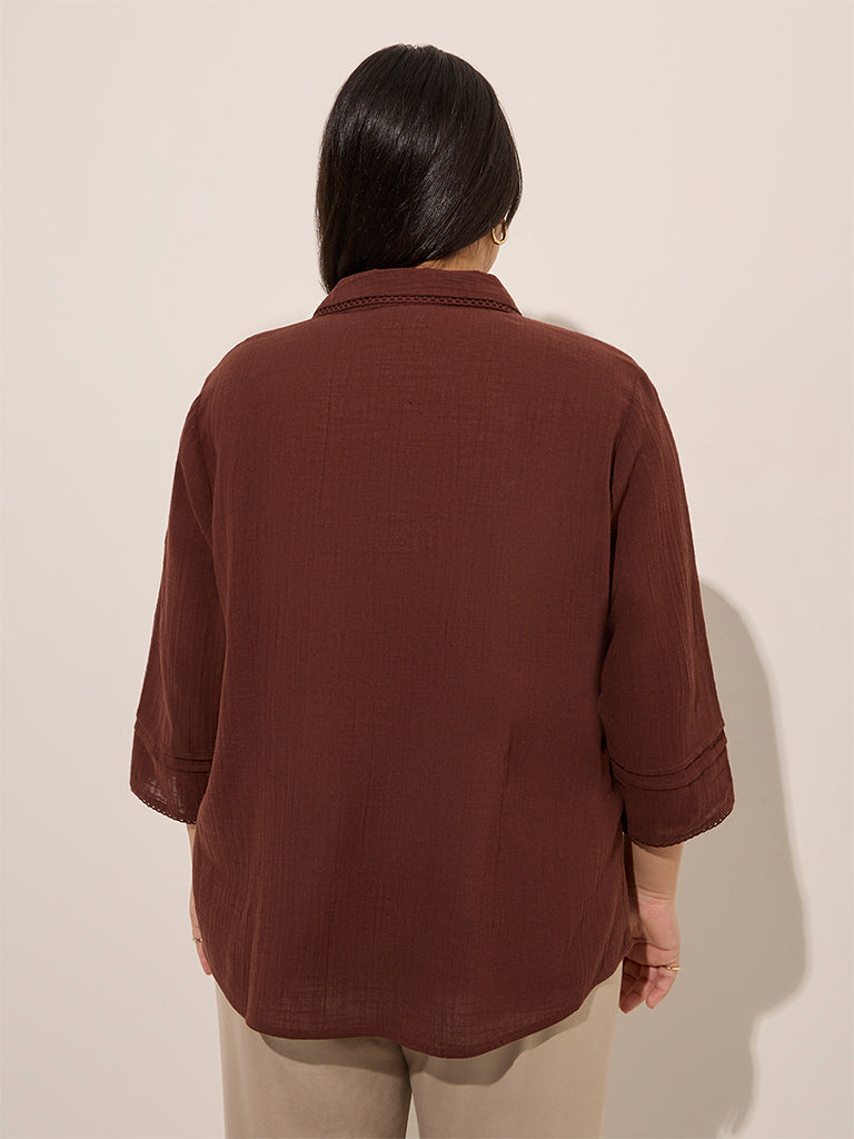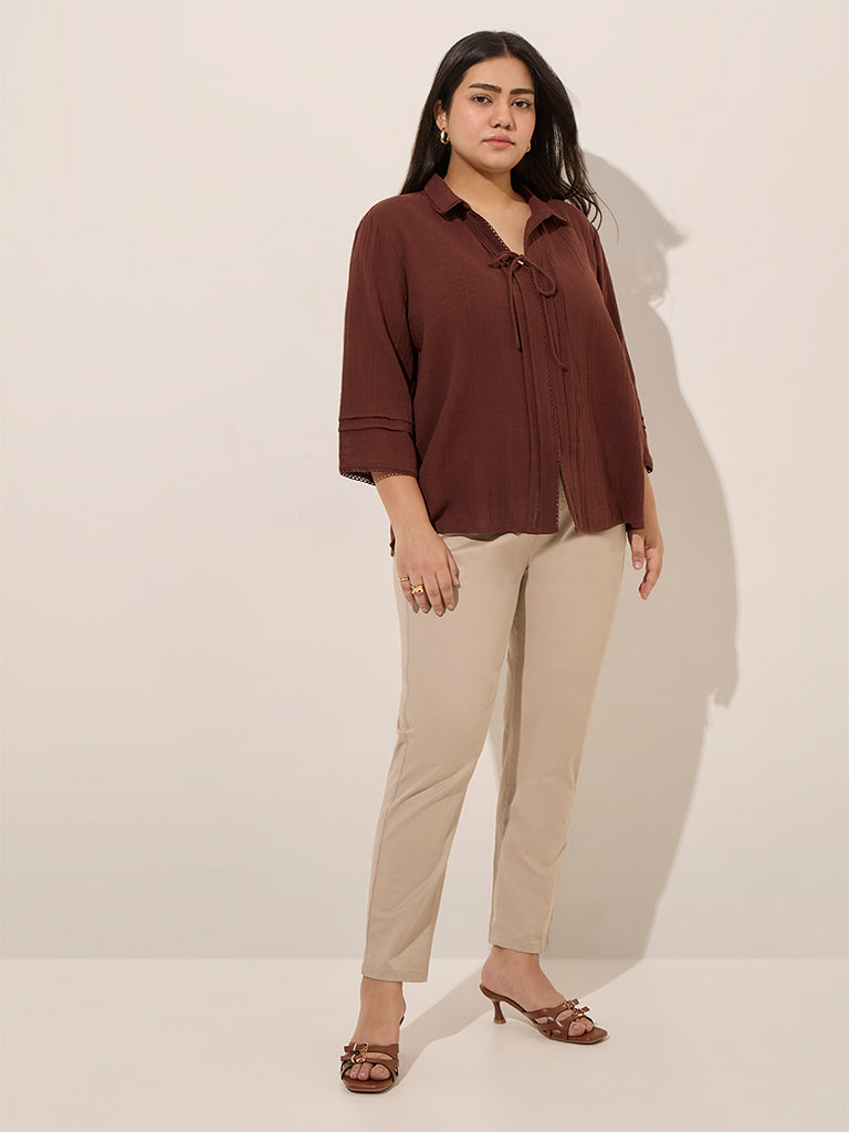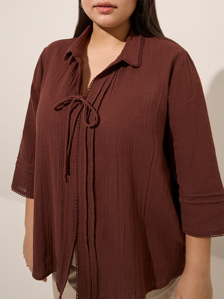 Elevate your casual wardrobe with this dark brown top from Gia. Designed with a relaxed fit. it features a collared neckline with a dainty tie-up detail. full sleeves. and intricate pintuck accents. offering a blend of elegance and comfort.