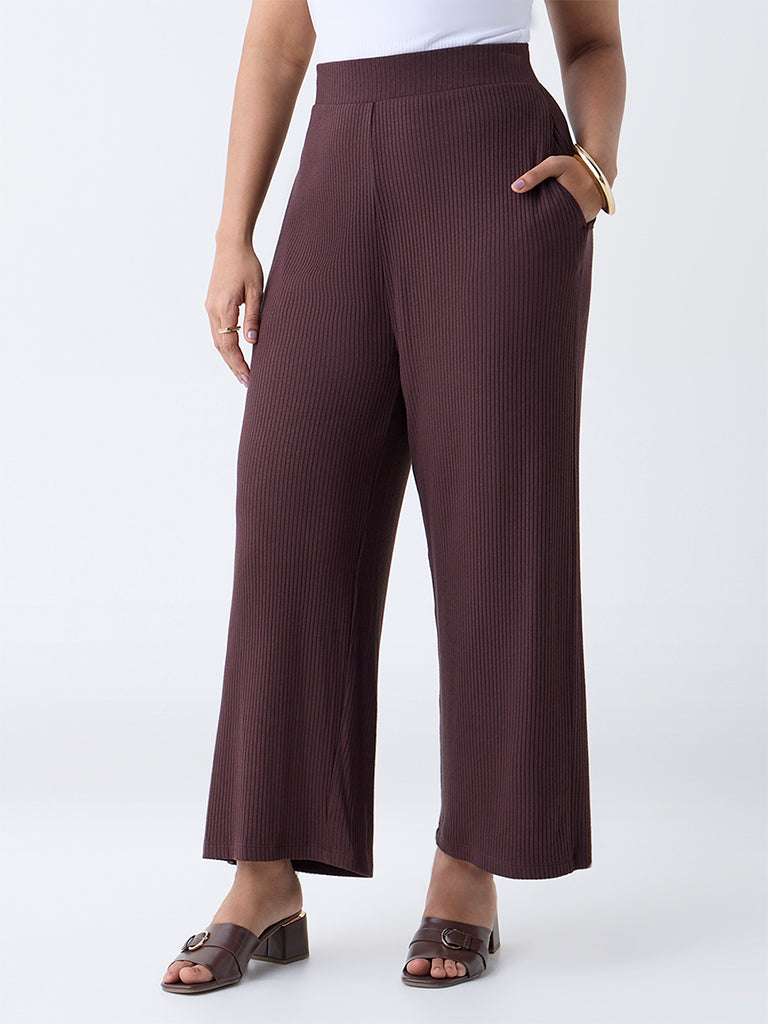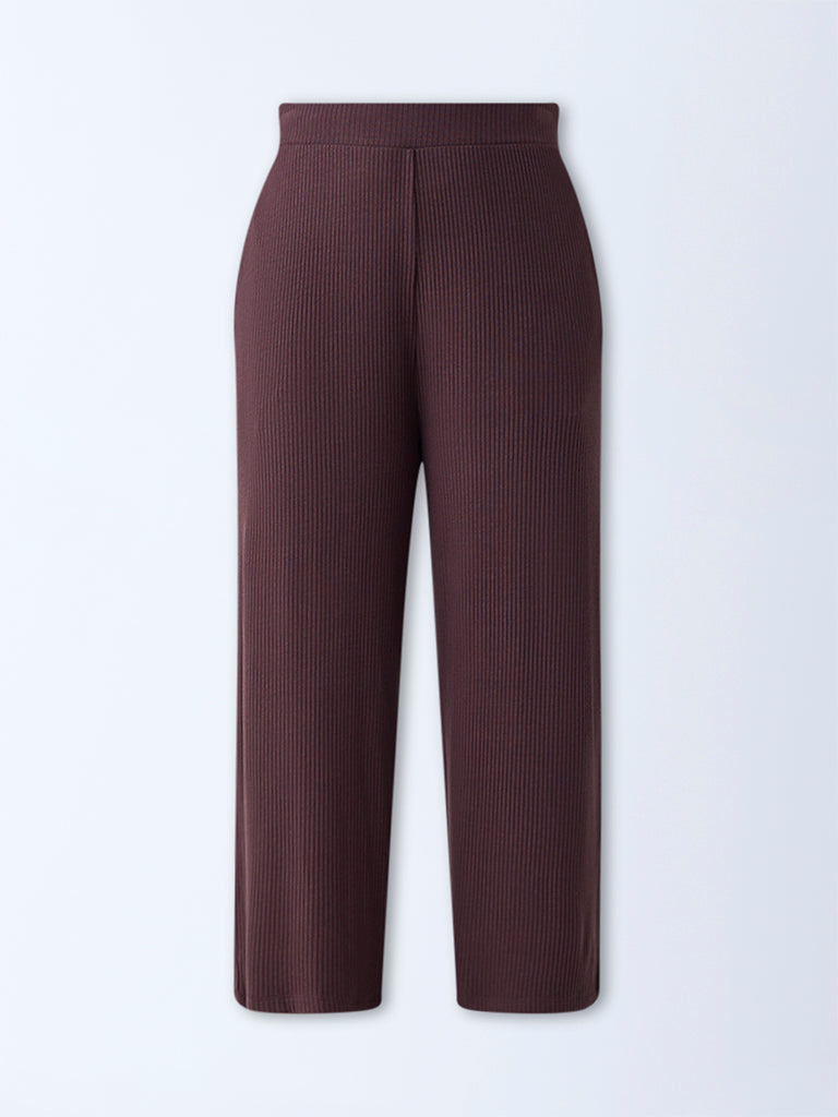 This pair of dark brown pants from Gia is designed in a high-rise frame with an elasticated waist for ease and flexibility. The ribbed texture lends a tactile finish. while the soft fabric ensures all-day comfort. A versatile style that transitions effortlessly between casual and semi-formal looks.