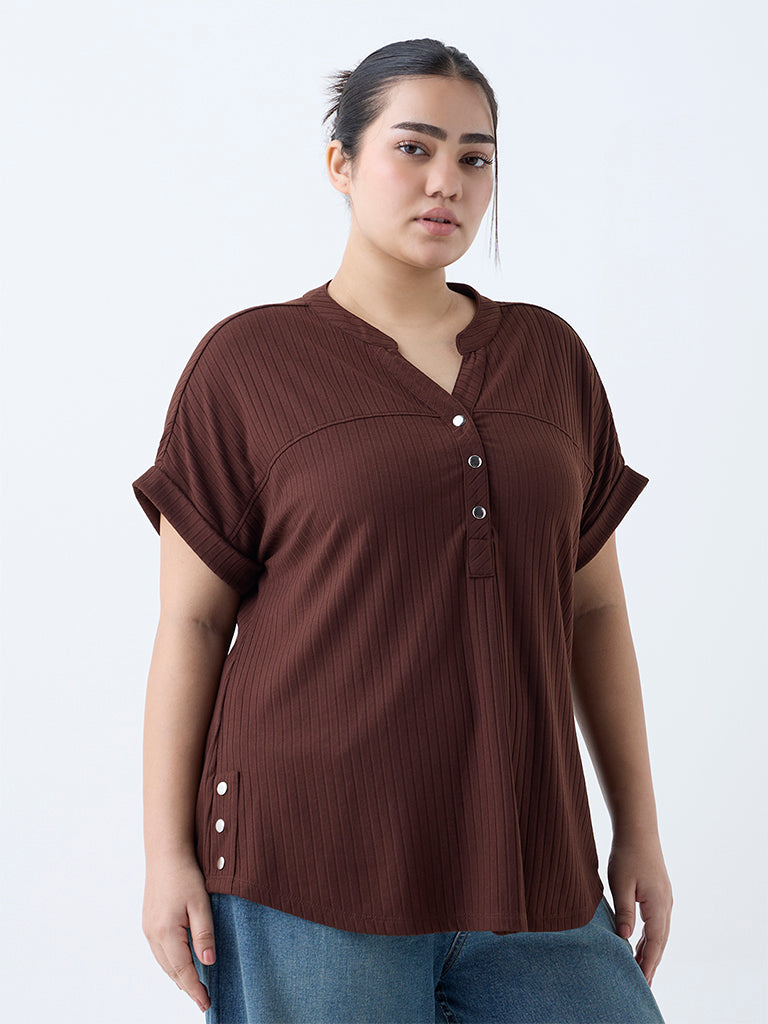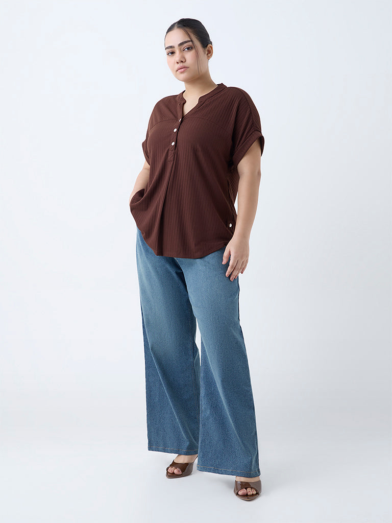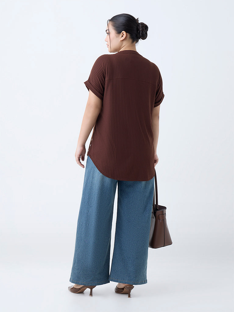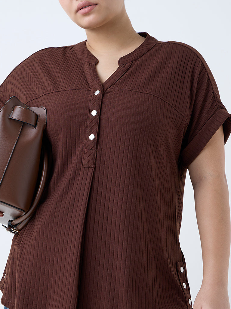 This dark brown top from Gia lends subtle texture to your look with its self-striped design. Woven from a breezy fabric for enhanced comfort. it is styled with a mandarin neck and a brief button placket. while upturned dolman sleeves offer a relaxed finish.