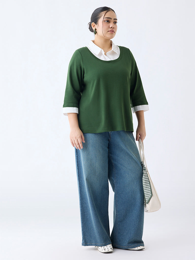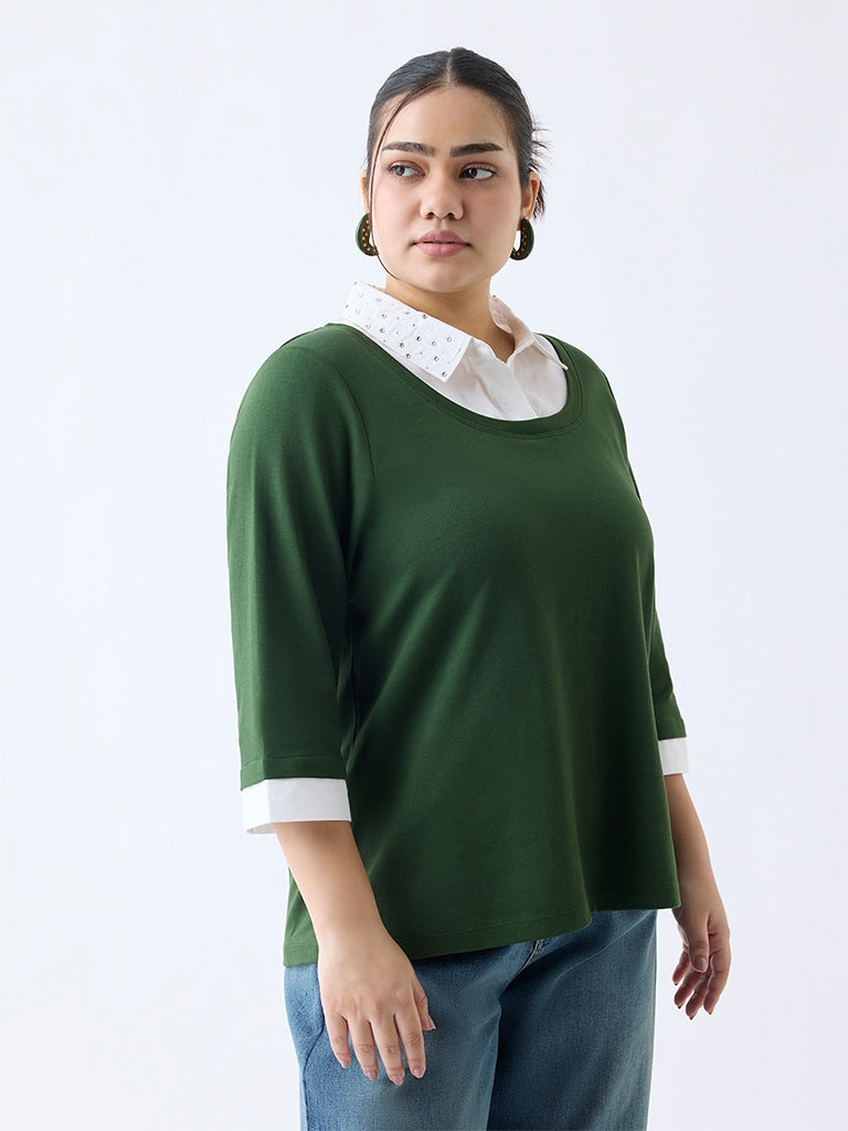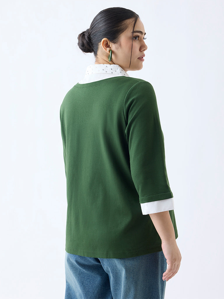 Stay effortlessly cool in this dark green top from Gia. The contrast white collar and cuff detail adds a touch of personality while the rhinestone detailing on the collar steals the show. Perfect for pairing with everything from skirts to denim for a chic. laid-back style.