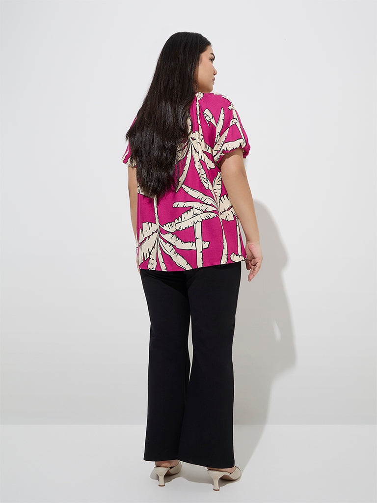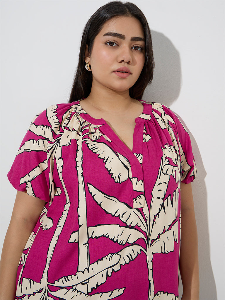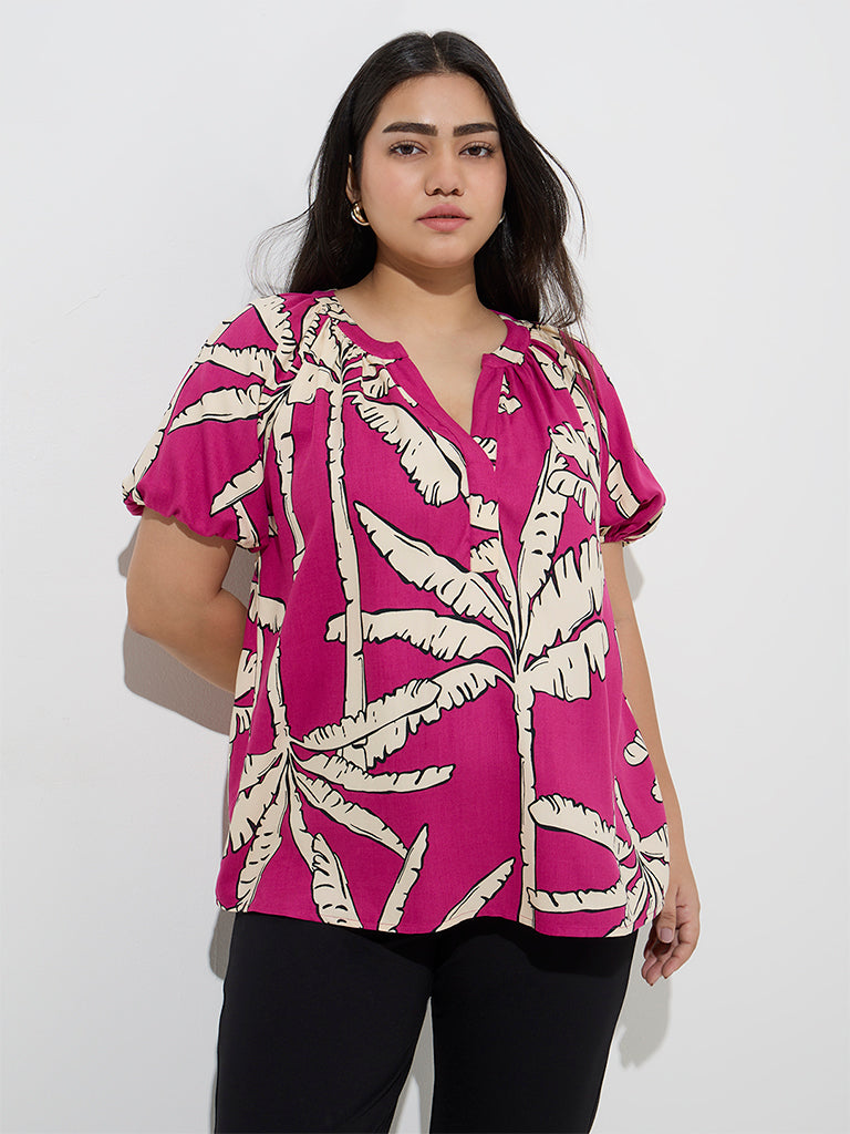 This fuchsia blouse from Gia showcases tropical motifs throughout. adding a playful touch to your look. Milled from a breathable fabric. it features a notched neckline that flows into a concealed placket. while puff sleeves lend a stylish finish.