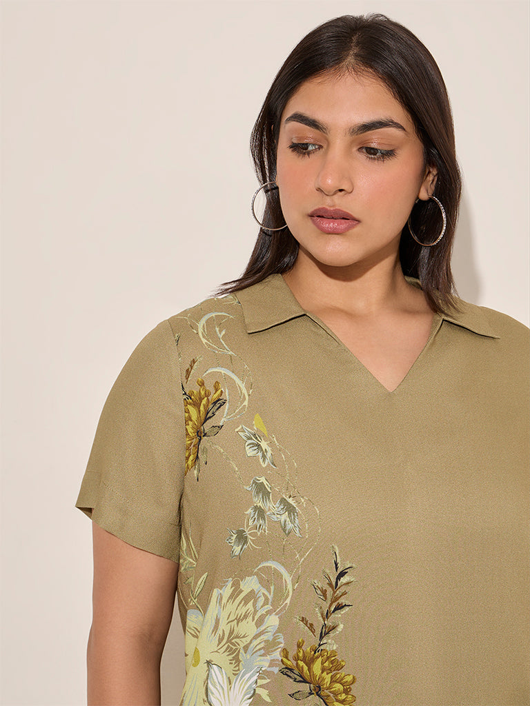 This khaki dress by Gia spotlights floral prints. Made from a lightweight fabric for all-day comfort. it features a shirt collar and short sleeves.