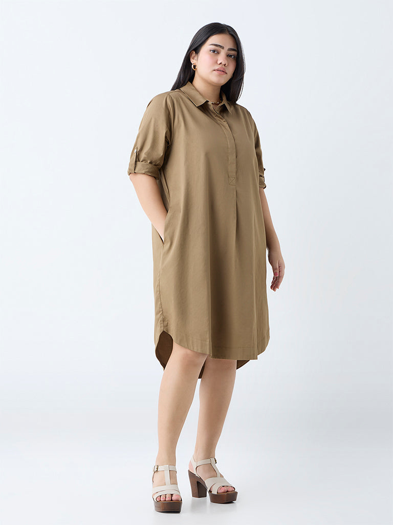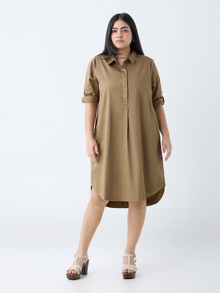 Amp up your outdoor style with this khaki shirtdress from Gia. Styled with a collar. concealed button placket and three-quarter sleeves. it’s milled from a premium fabric and finished with side pockets for added functionality.