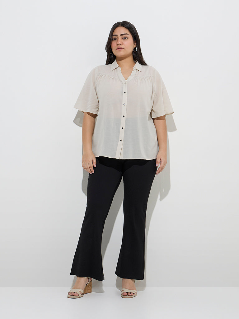 This light beige blouse by Gia is crafted from a cotton-blend fabric. ensuring ease throughout the day. It features a semi-spread collar that transitions into a V-neck with a brief placket for added detail. Finished with dolman sleeves. this piece makes a stylish and effortless choice for summer outings.