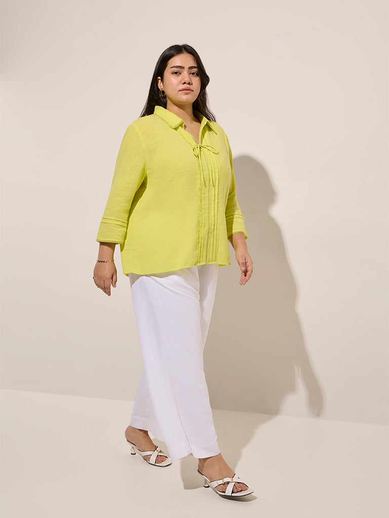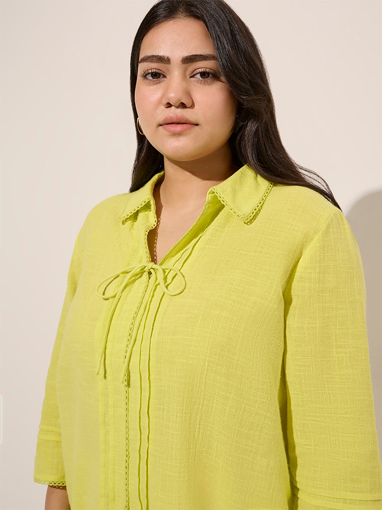 This lime green top from Gia is a versatile addition to your wardrobe. Featuring a delicate tie-up neckline and full sleeves. it’s crafted from breathable fabric for all-day comfort. Perfect for both casual outings and relaxed workdays.