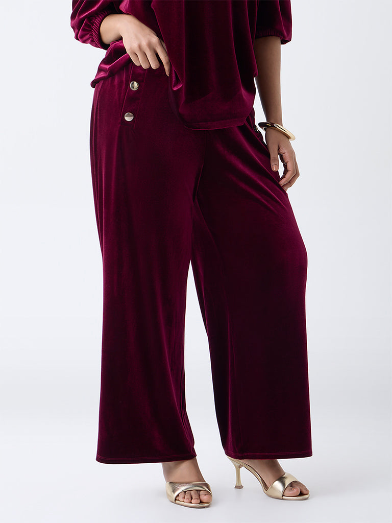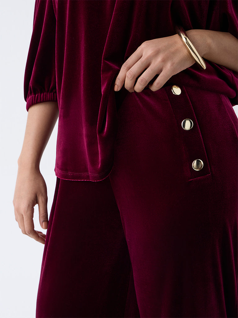 These maroon pants from Gia exude understated glamour. Crafted from a plush velvet fabric. they feature gold-toned button detailing on the side pockets for a hint of shine. The elasticated waistband ensures a flattering fit that pairs beautifully with evening blouses or casual knits.