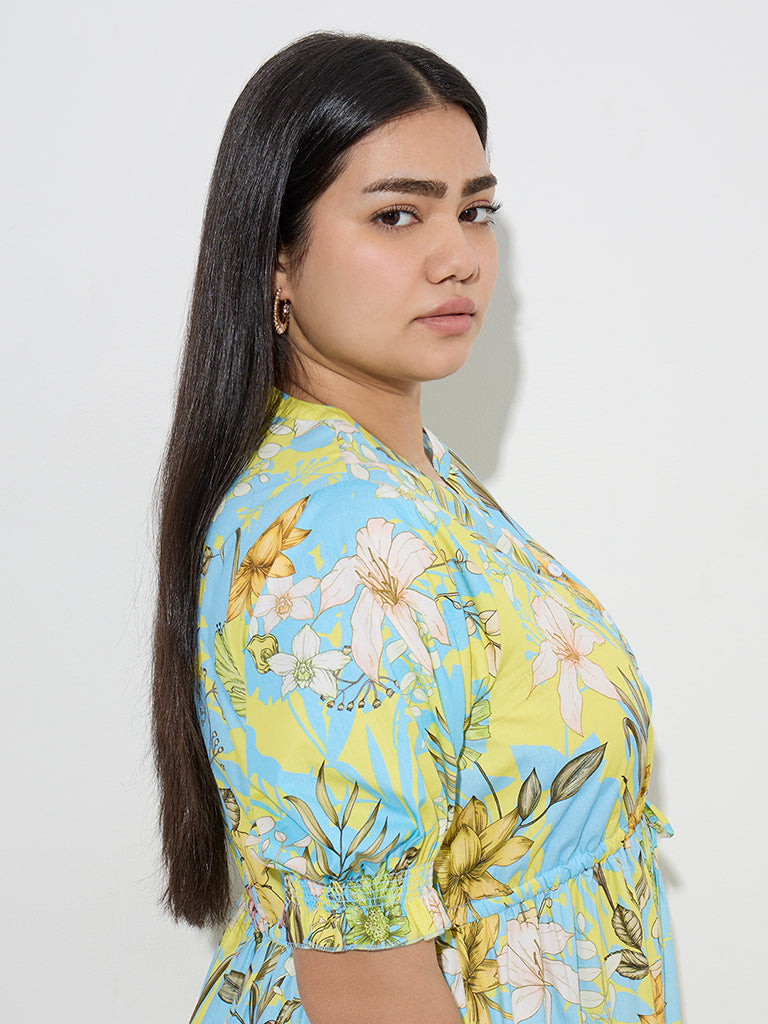 Adorned with vibrant botanical prints. this multicolour dress from Gia exudes effortless charm. Crafted from pure cotton. it boasts a breezy tiered silhouette with an elasticated detail below the bust for a flattering fit. The notched neckline extends into a four-button placket. while puffed sleeves and side pockets enhance both elegance and functionality.