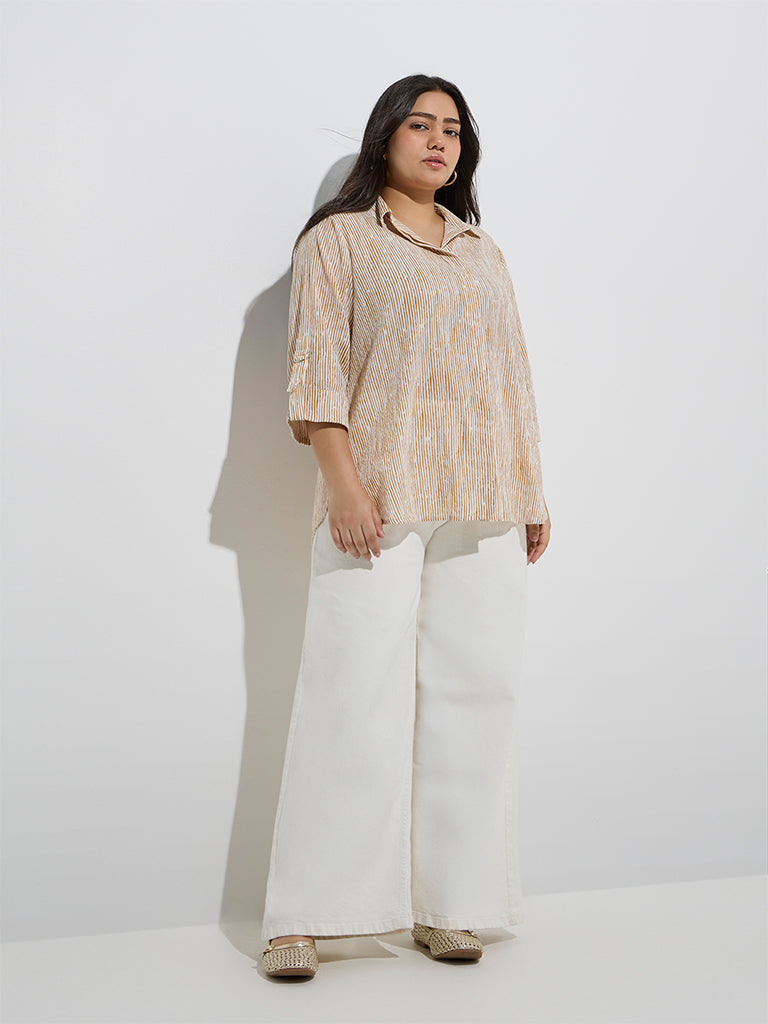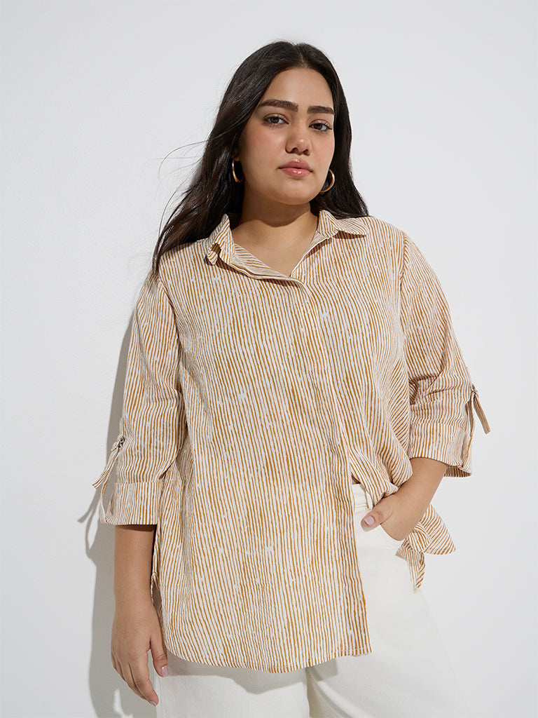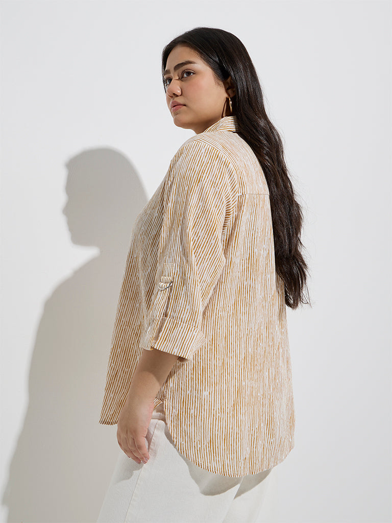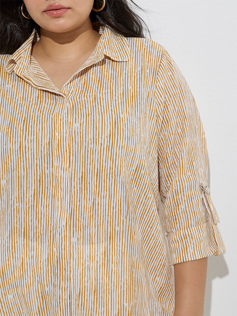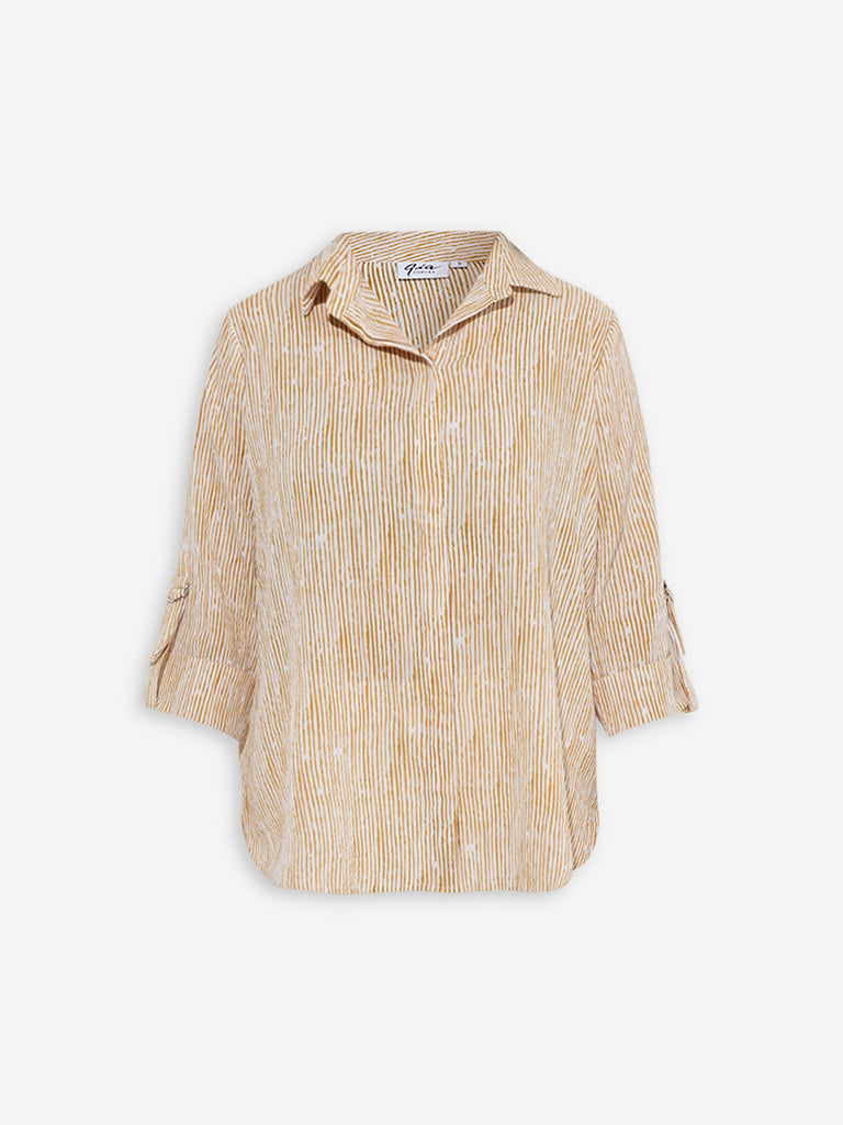 Brighten your wardrobe with this mustard shirt from Gia. a harmonious blend of comfort and style. Its soft cotton-rich fabric is beautifully patterned with stripe prints. offering a fresh aesthetic. Designed with a classic collar and a concealed button placket. it boasts three-quarter sleeves accented with buckle detailing for a refined look.