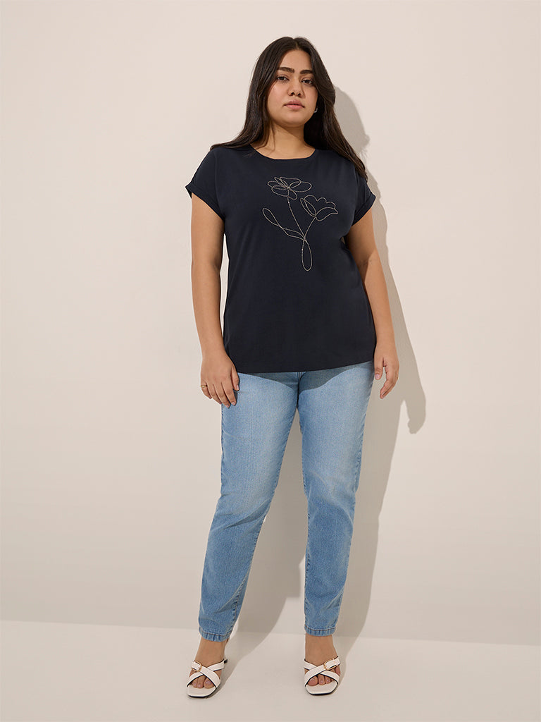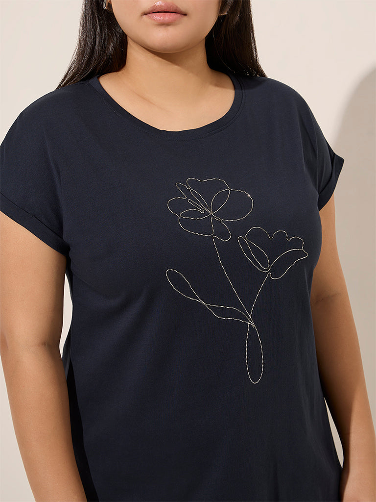 Gia Navy Floral Embroidered Cotton T-Shirt
