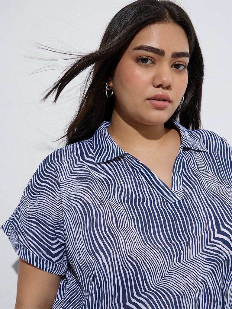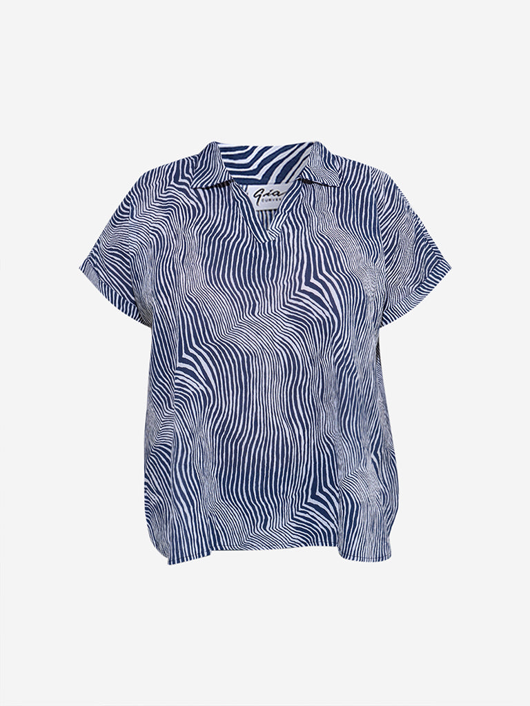 This navy top from Gia is milled from pure cotton for elevated comfort. Abstract detailing adds unique character. while the V-neck collar and dolman sleeves with upturned cuffs create a relaxed yet refined silhouette.