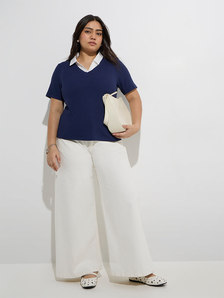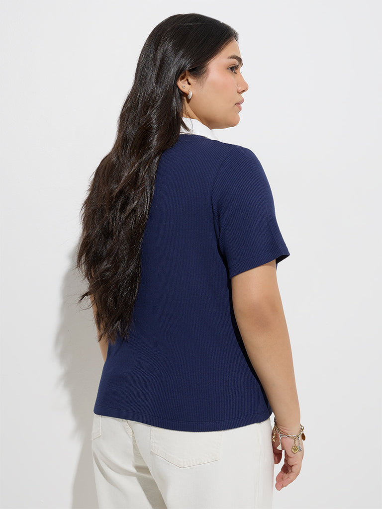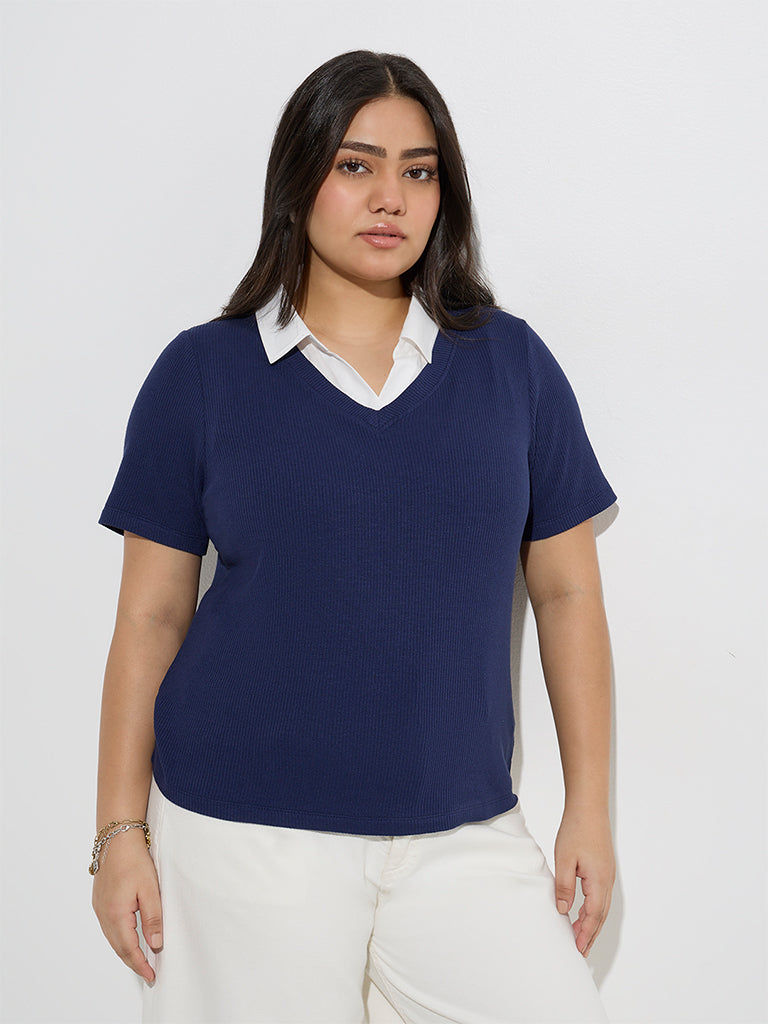 Gia launches this navy t-shirt. blending smart style with everyday ease. Woven from a ribbed-textured fabric. it features a sharp collar paired with a clean V-neck for a layered effect minus the bulk. Finished with half sleeves. it’s a versatile pick for casual or polished looks.