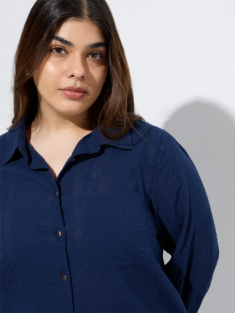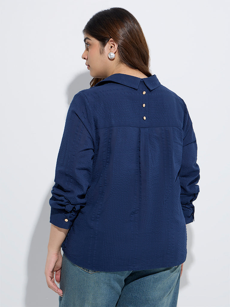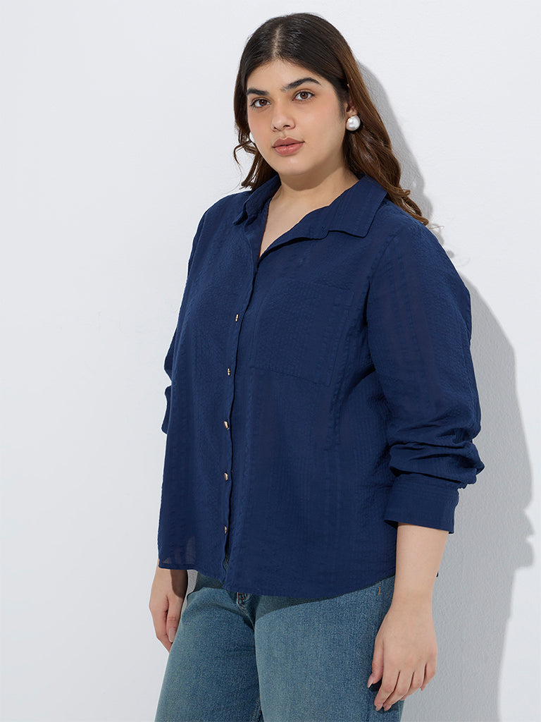 Crafted from pure cotton with a breezy seersucker striped texture. this navy shirt from Gia is perfect for elevating your everyday wardrobe. Thoughtfully designed. it features a spread collar and 3/4th sleeves. while the chest pocket and gold-toned button placket lend just the right amount of polish.