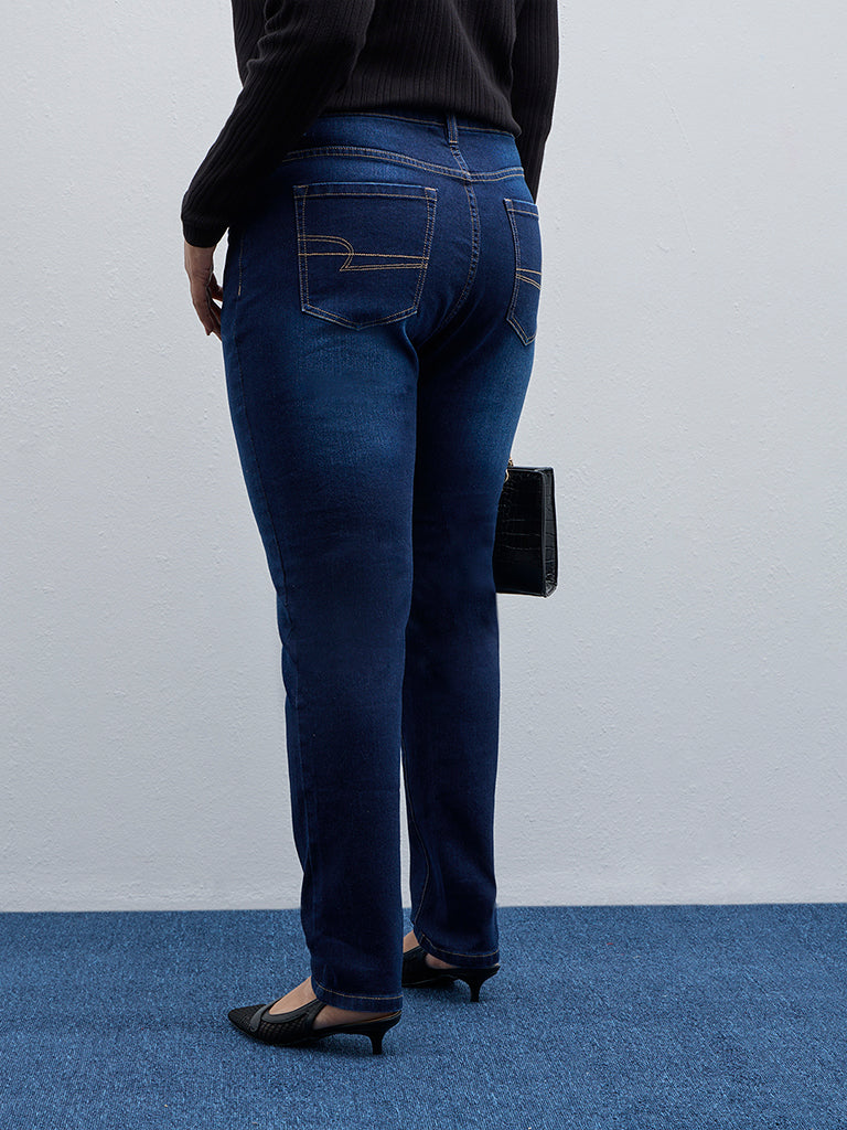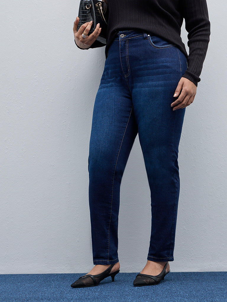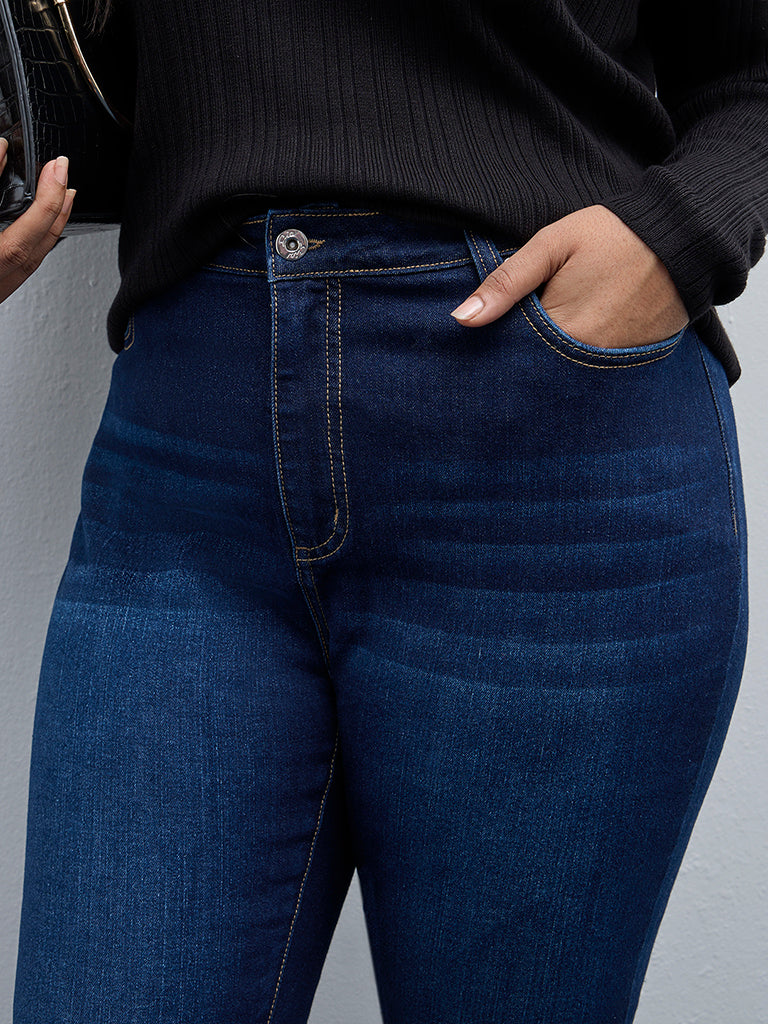 Gia brings you these navy blue denim jeans in a cotton-rich blend. The high-rise bottom wear carries a smooth buttoned waistband. belt loops. zipper fly and multiple pockets.