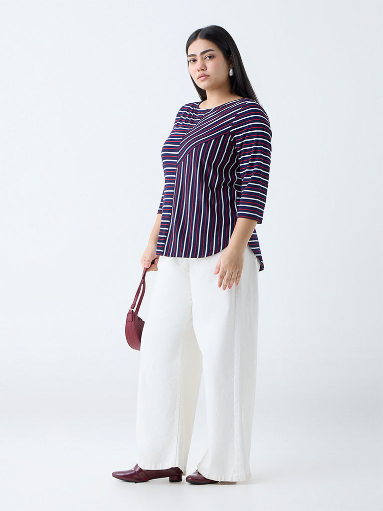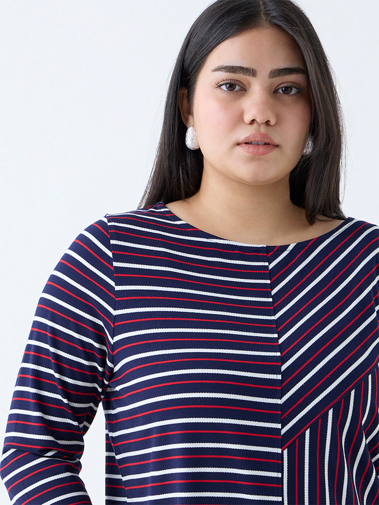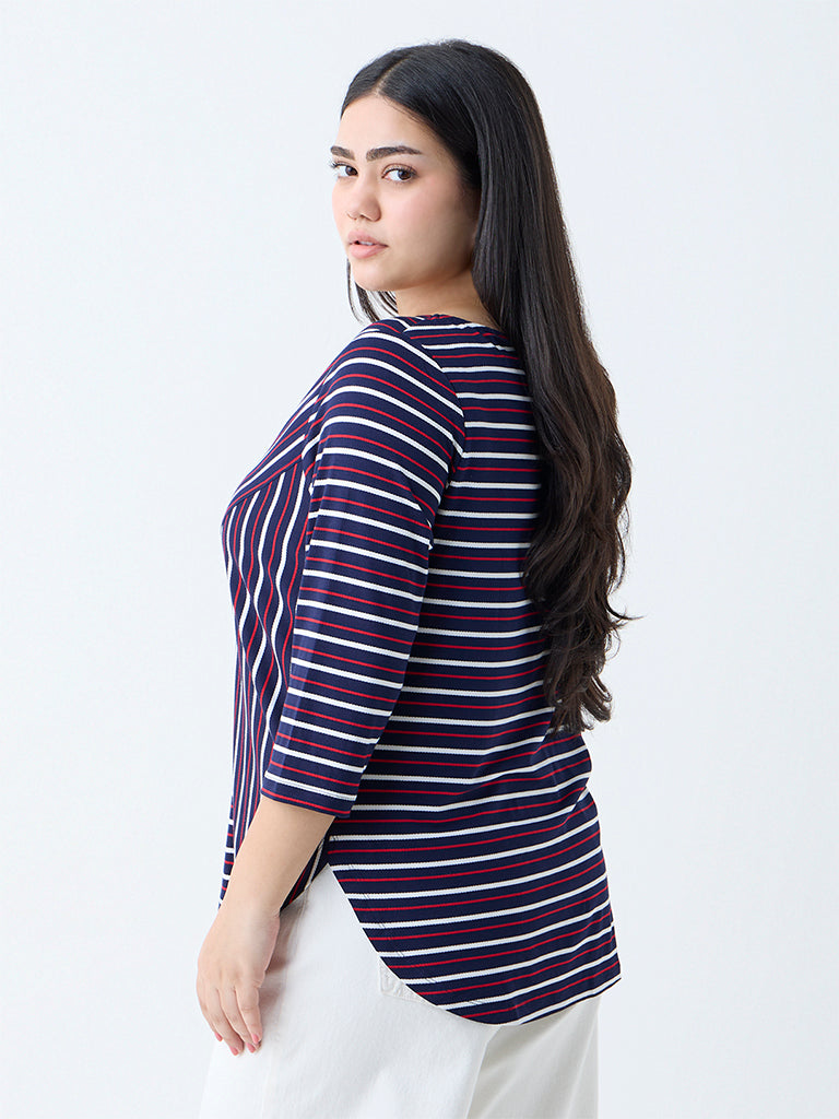 Strike the perfect balance between classic and contemporary with this navy t-shirt from Gia. patterned with playful contrast stripes. Created from a lightweight fabric for breathable comfort. it’s styled with a round neck and three-quarter sleeves.