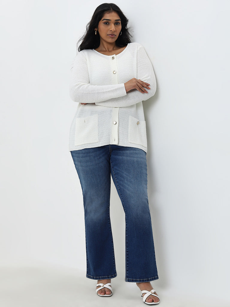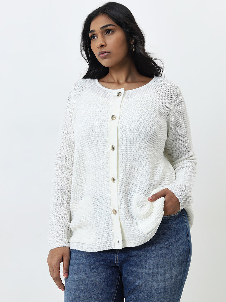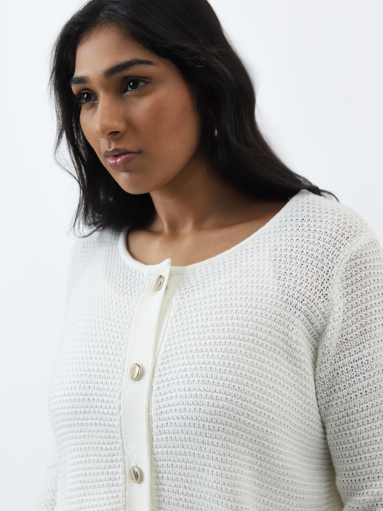 This off-white cardigan by Gia is a crochet piece adorned with metal-accent buttons. It is made from pure acrylic fabric and flaunts a round neckline extending into a button placket. full sleeves and front pockets.