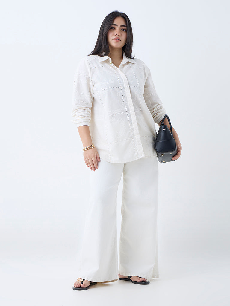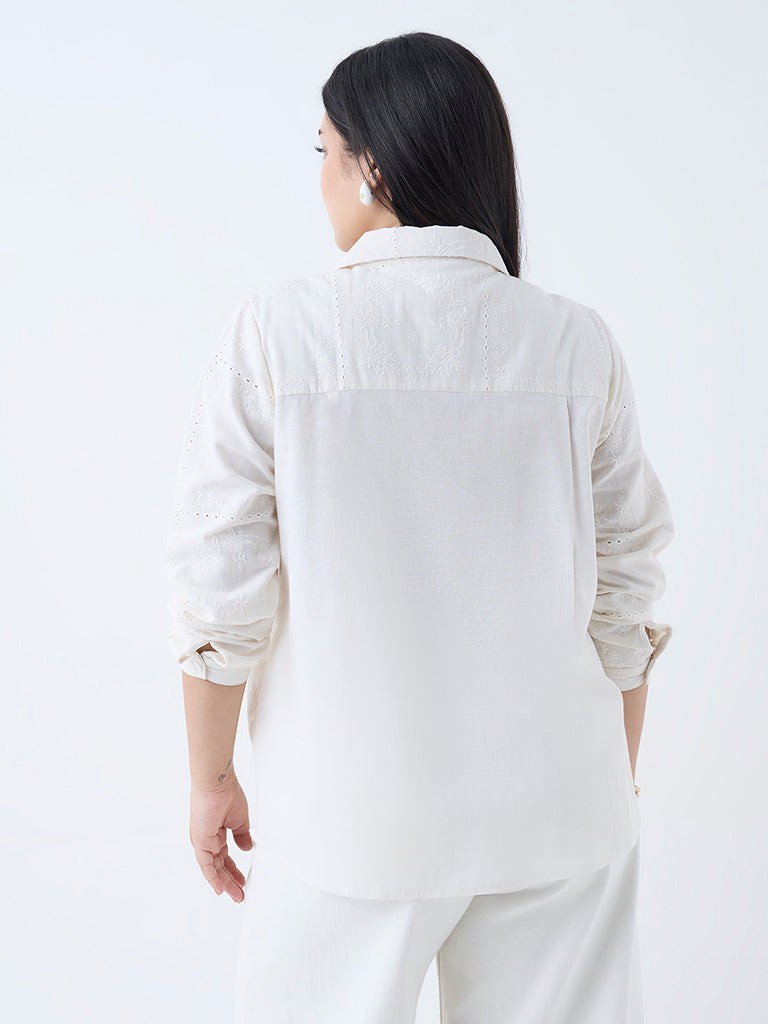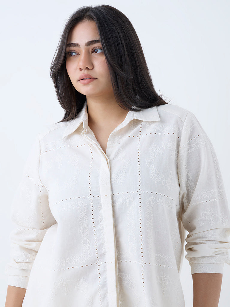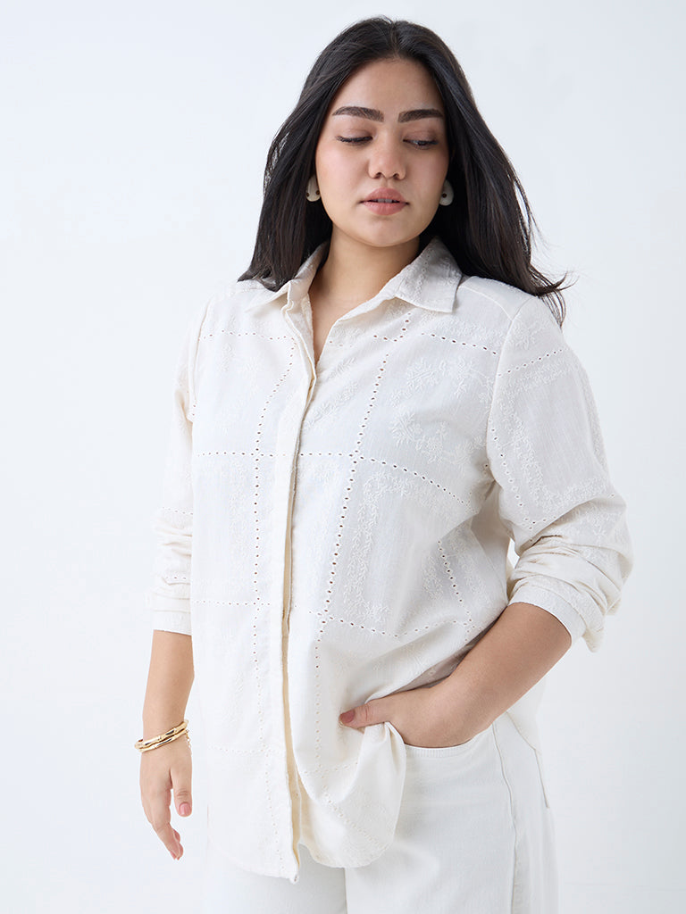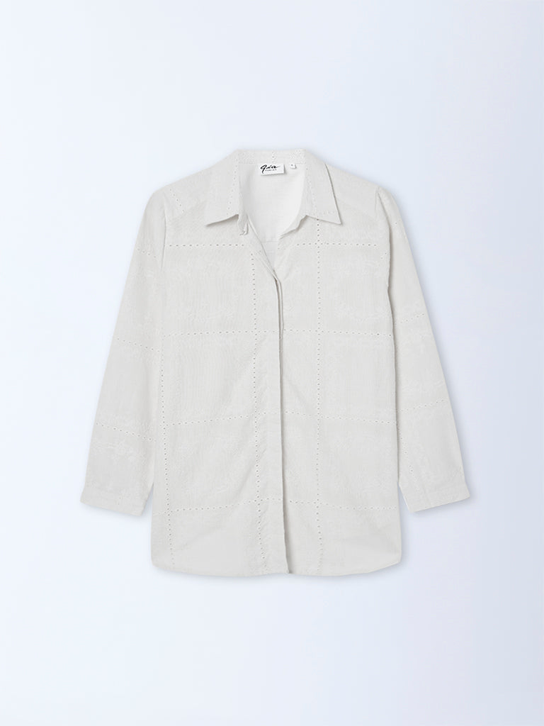 This off-white shirt from Gia is elevated with intricate embroidery that adds texture and elegance. Designed with a structured collar. button placket and full sleeves. it pairs effortlessly with tailored or casual separates for a polished look.