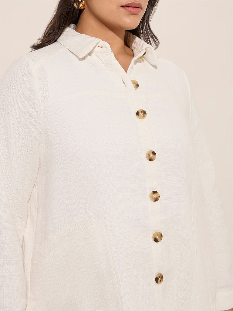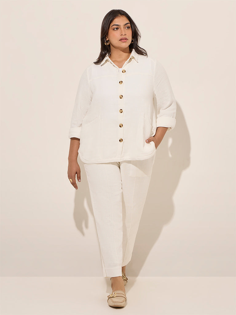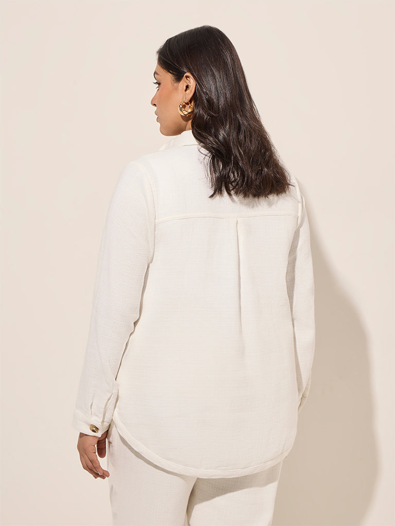 This off-white shirt by Gia is woven from pure-cotton material with a high-low hemline. It boasts a classic collar that extends to a button placket and full sleeves.