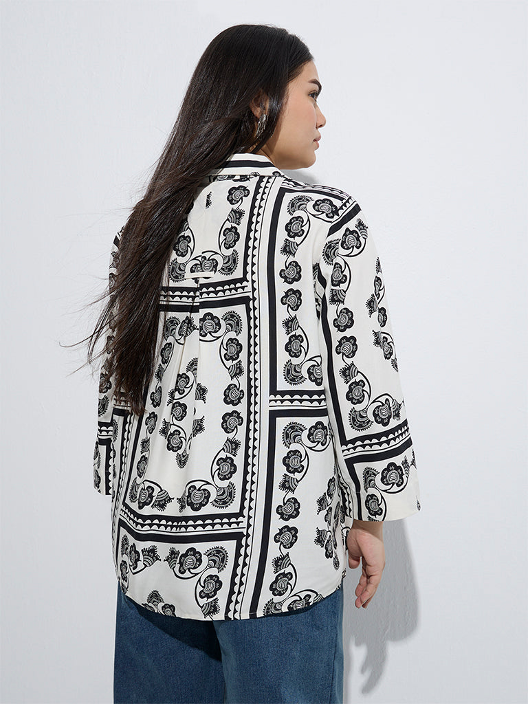 Gia brings this off-white shirt featuring striking patterns and crafted from soft. breathable fabric. Designed with a spread collar and three-quarter sleeves. it offers a versatile and breezy addition to your everyday wardrobe.