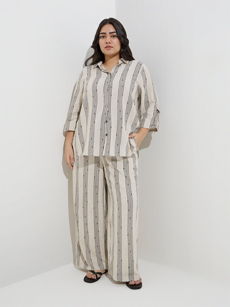 Gia launches this off-white shirt designed with a semi-spread collar and extending to a concealed button placket. Showcasing stripe prints. this linen-blend garment is completed with three-quarter sleeves offering a structured look for chic occasions.