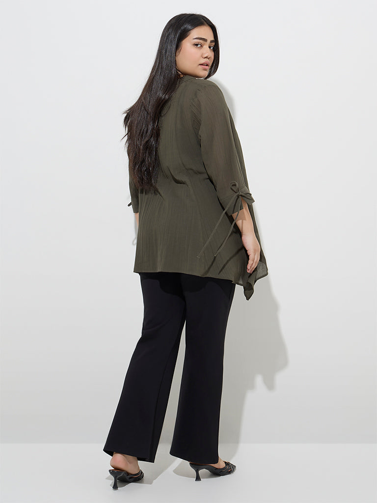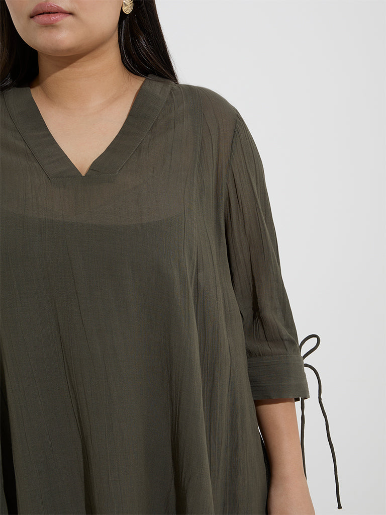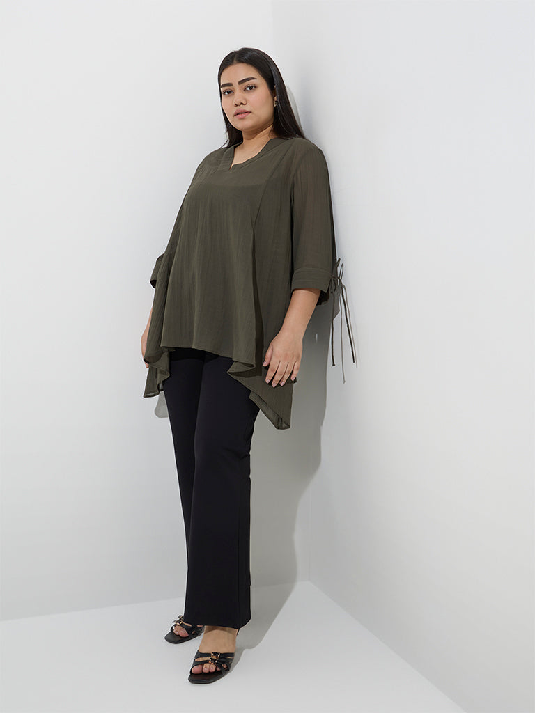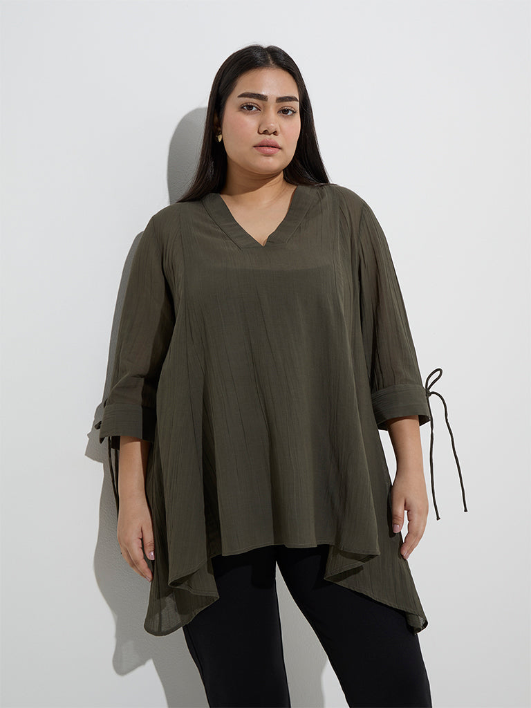 This olive blouse from Gia is made from a crinkle-textured fabric for added visual interest. Designed with a flattering V-neck and three-quarter sleeves with tie-up detailing. it is finished with an asymmetrical hemline for a modern twist.