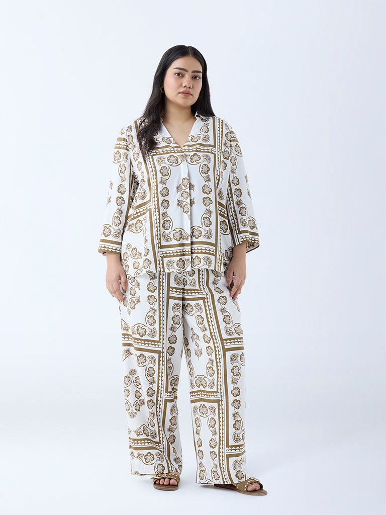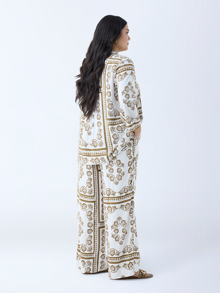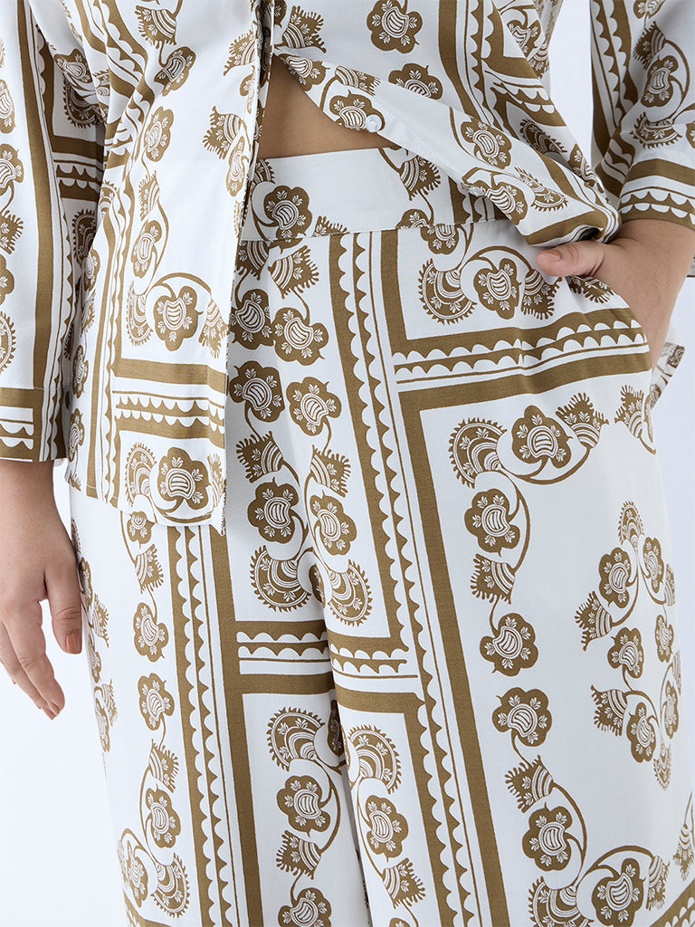 These olive trousers from Gia are patterned with florals that lend a quiet statement to an otherwise effortless silhouette. Cut from a breathable fabric. they feature an elasticated waistband for ease and side pockets that keep things functional.