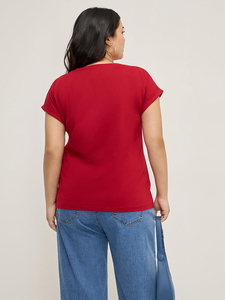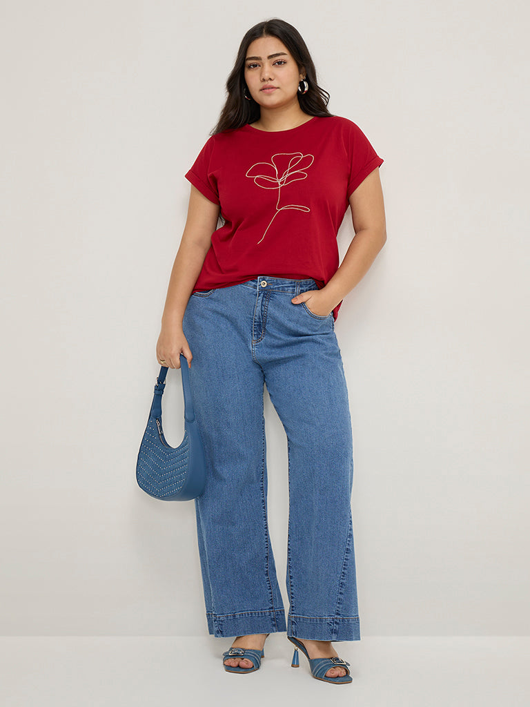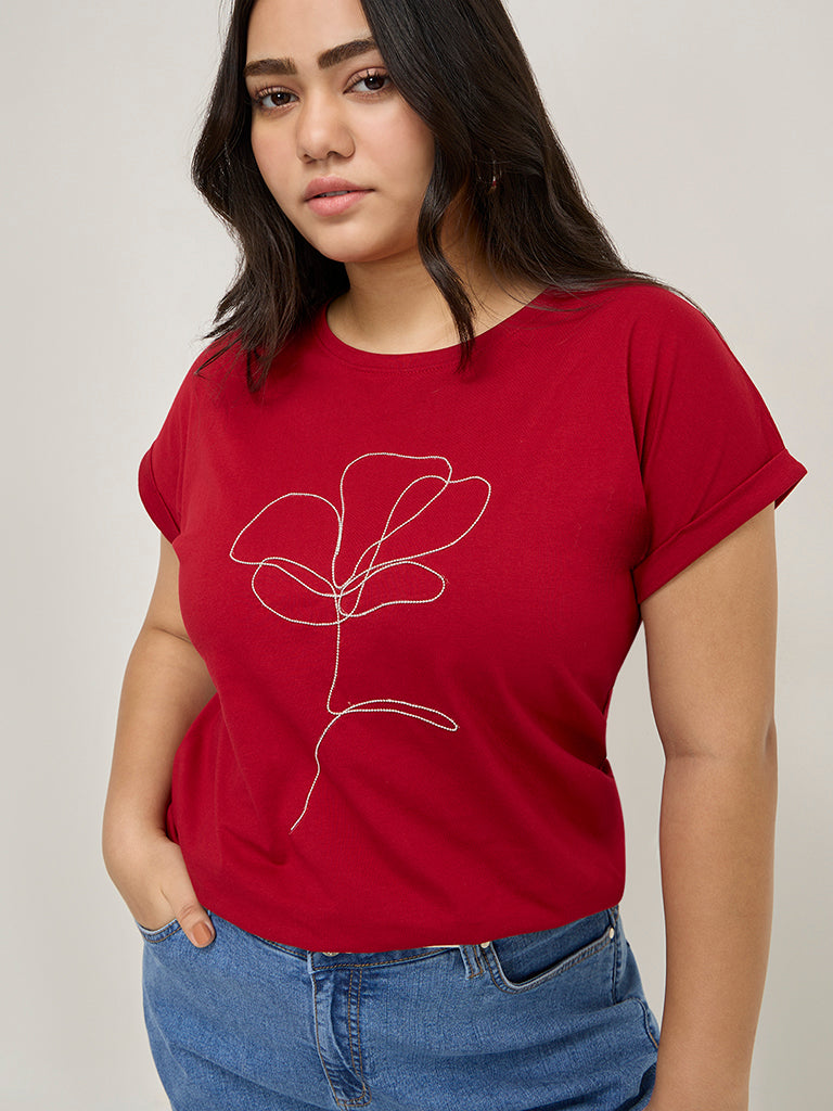 Gia presents this red t-shirt adorned with floral embellishments. Crafted with pure cotton. it includes a round neck and dolman sleeves.