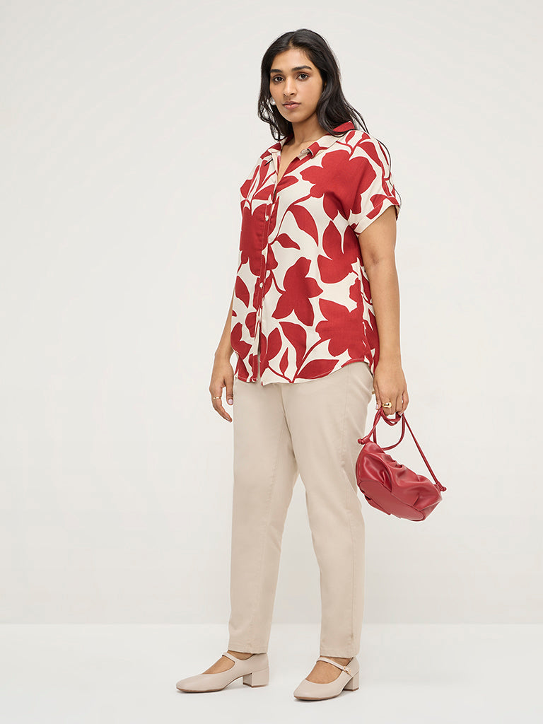 Gia launches this red shirt fashioned with large floral prints. Built with quality fabric. it includes a notched collar. button down front and dolman sleeves.