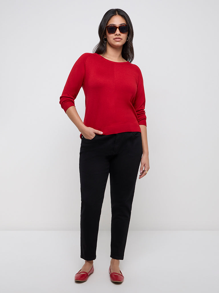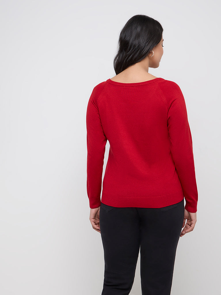 Gia presents this red sweater in a luxurious knit texture. Crafted with soft. warm fabric. the winter wear includes a round neck and full sleeves.