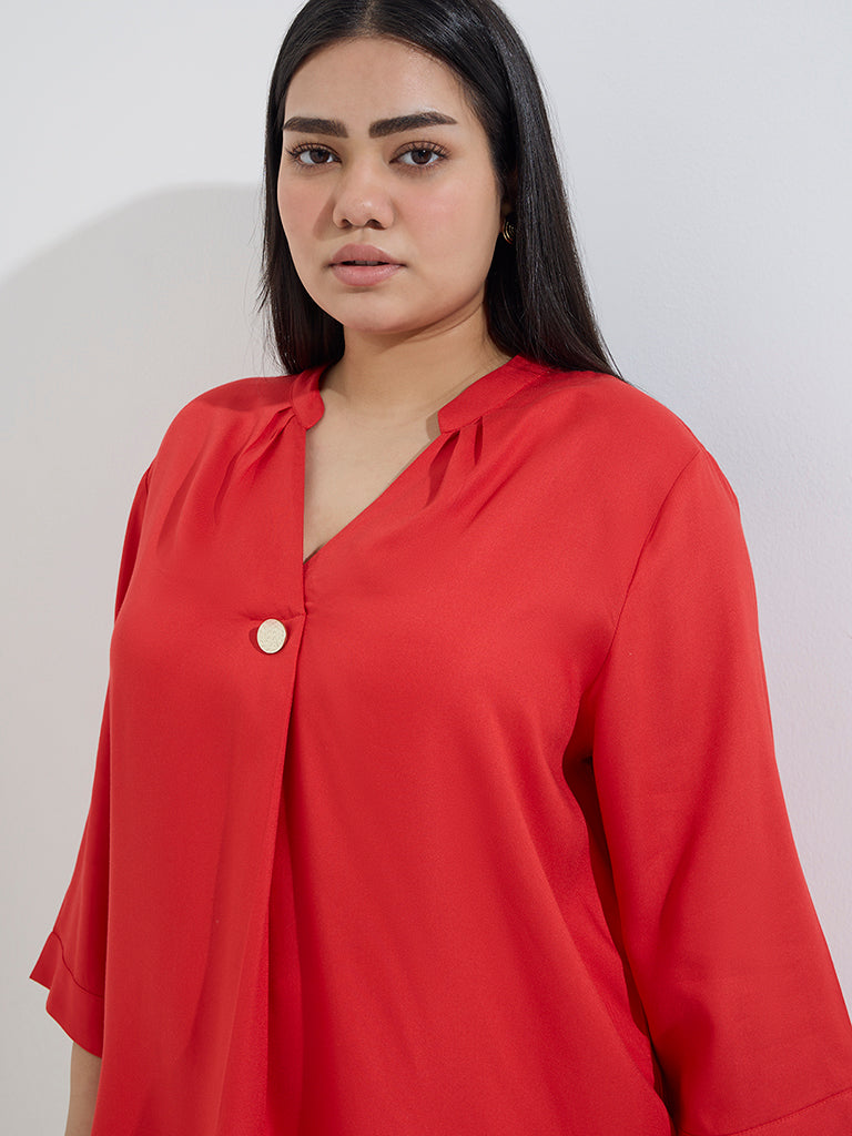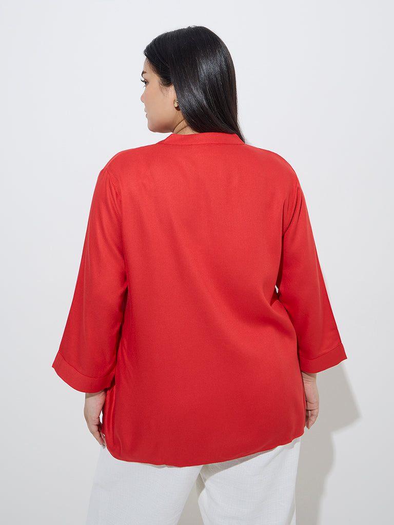 This red blouse by Gia. crafted from a lightweight fabric. offers effortless comfort. Designed with a mandarin collar and three-quarters sleeves. it blends elegance with everyday ease.
