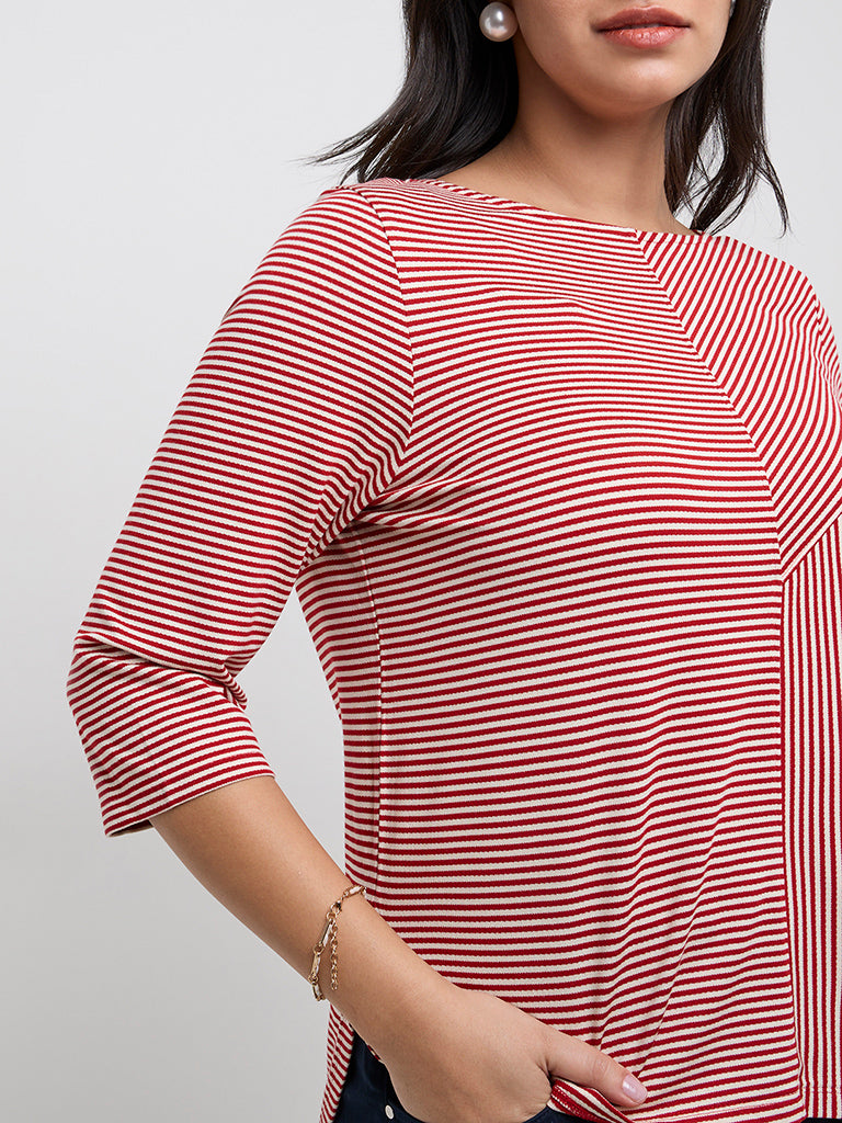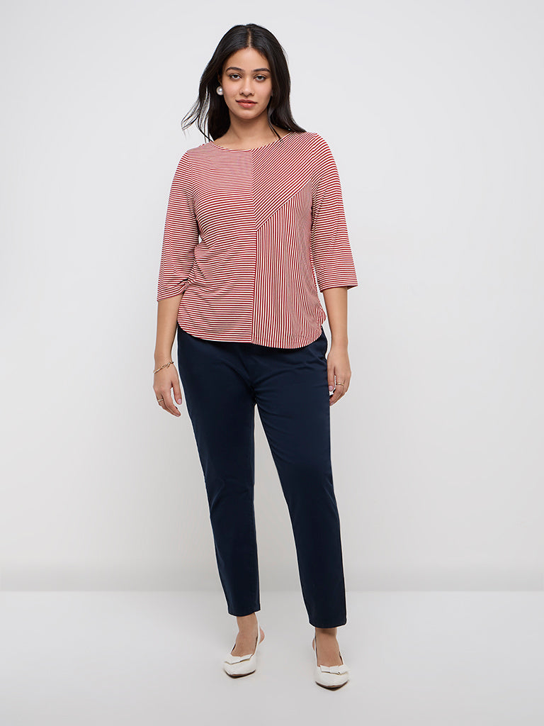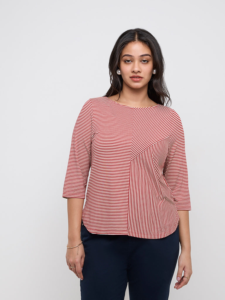 Gia brings you this red t-shirt in striped design. The soft and stretchable fabric garment includes a round neck and 3/4th sleeves.