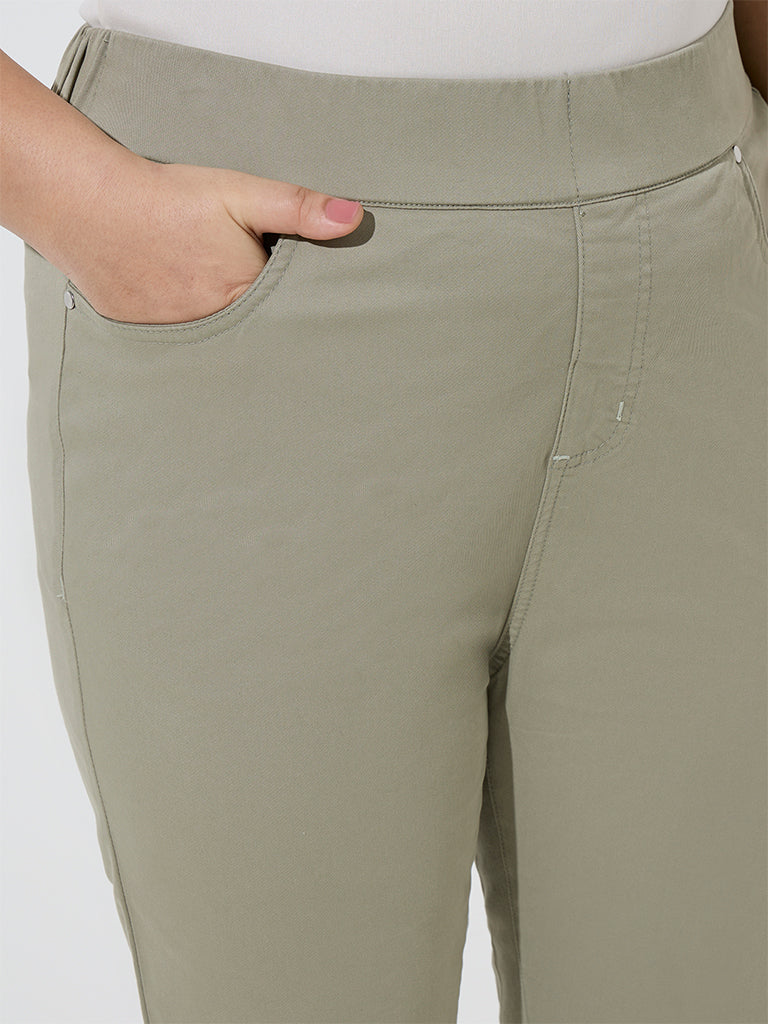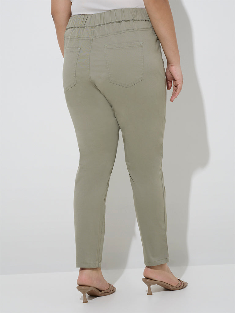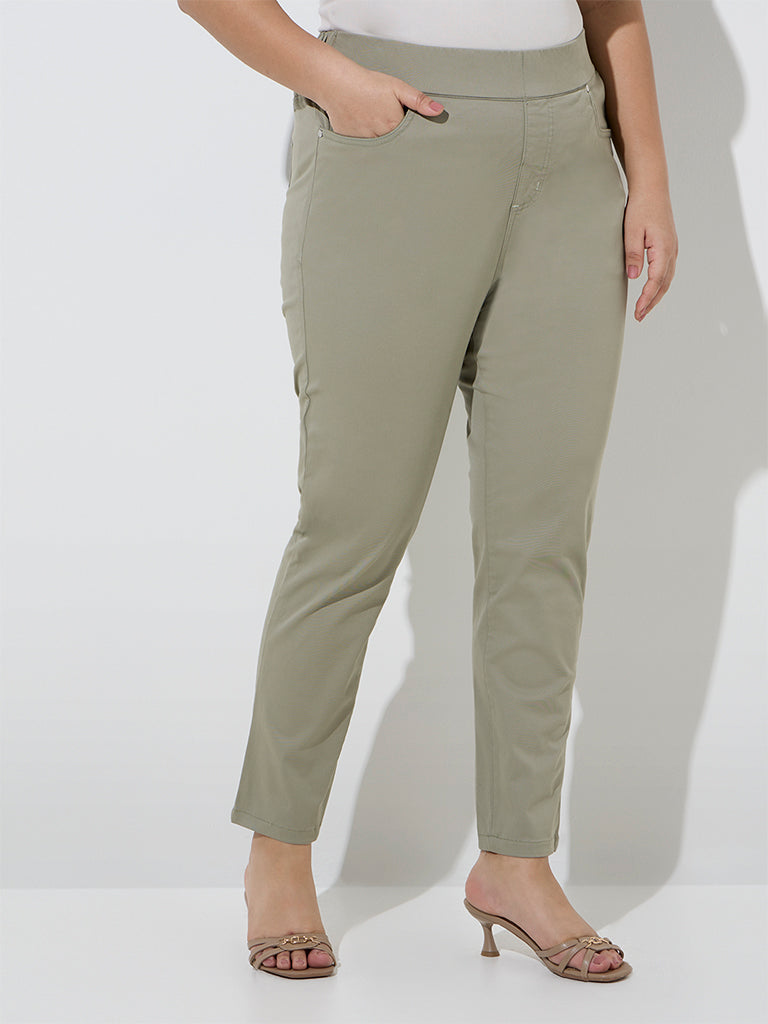 Gia presents these sage jeggings. designed in a flattering high-rise silhouette. Crafted from a comfortable cotton-blend fabric. they feature a faux zipper fly. an elasticated waistband. and multiple functional pockets for effortless style and utility.