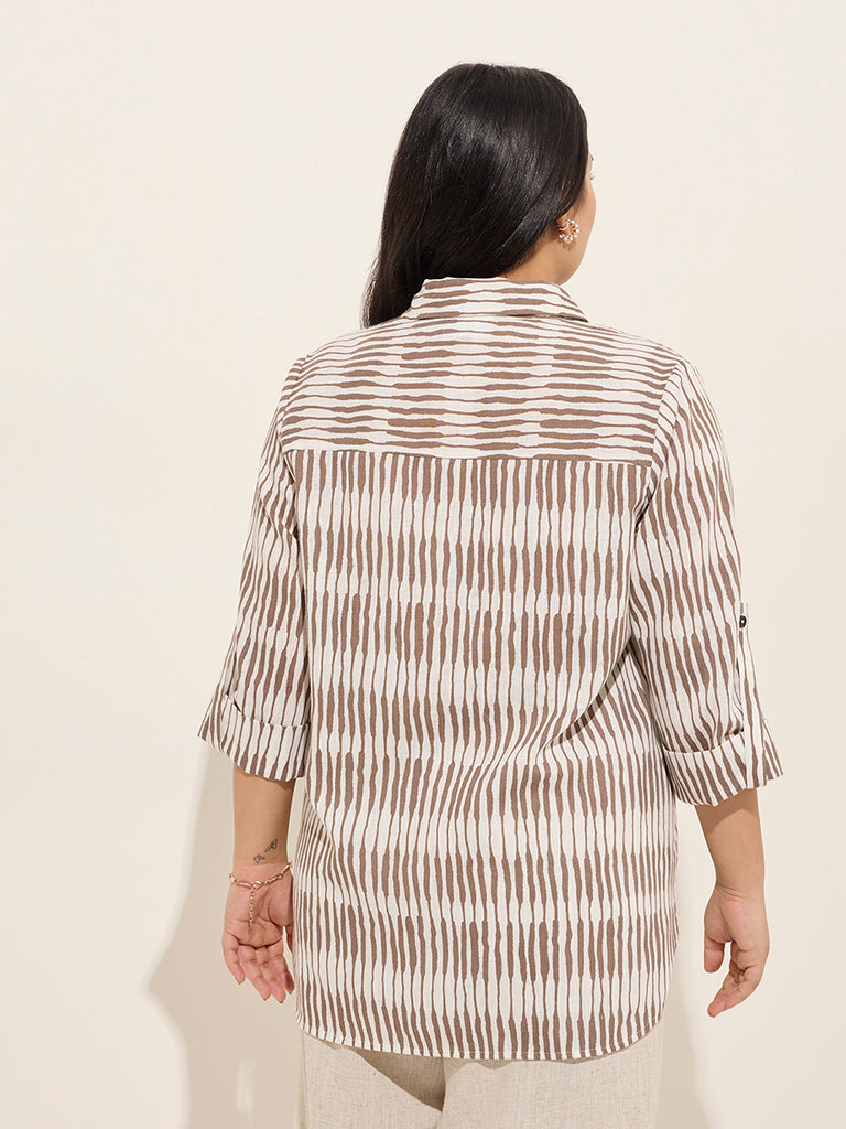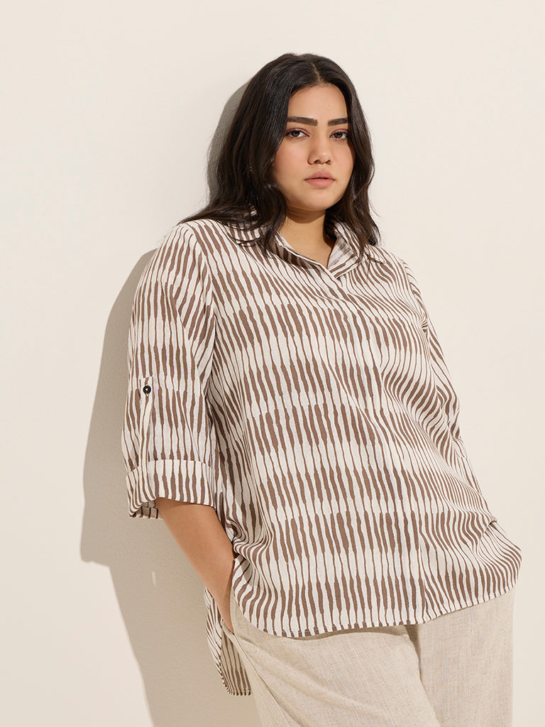 Showcasing abstract patterns. this taupe shirt from Gia is designed with a high-low hemline. Its lightweight build ensures superior comfort. while the collar and 3/4th sleeves complete it.