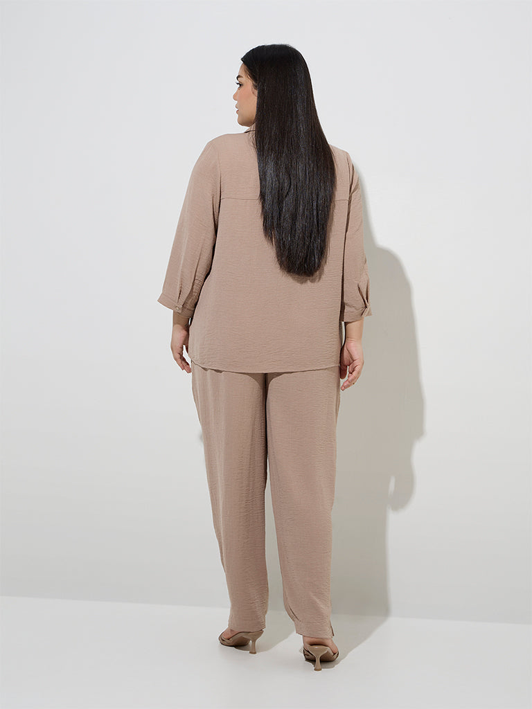 These taupe pants from Gia showcase a crinkled texture that adds subtle dimension to their design. Crafted from a breathable fabric. they feature an elasticated waistband accented with button detailing. while the side pockets enhance practicality.