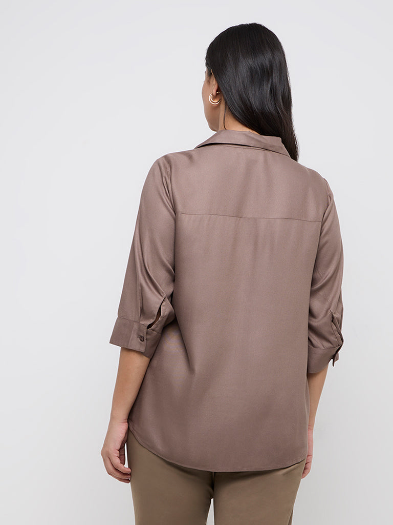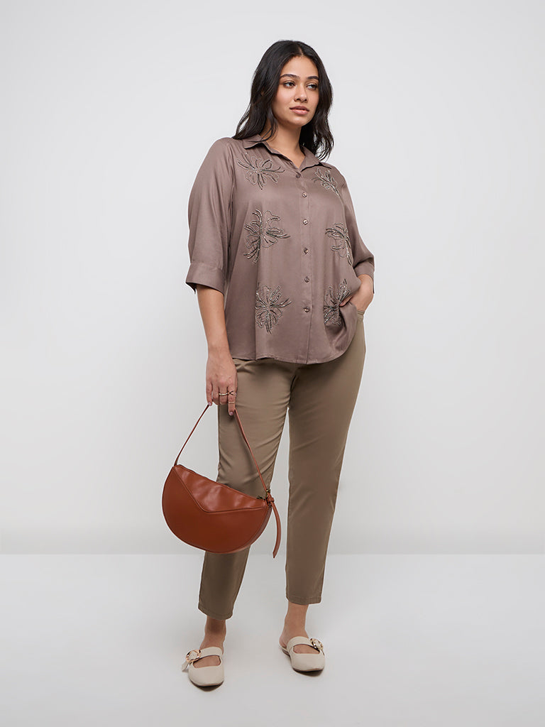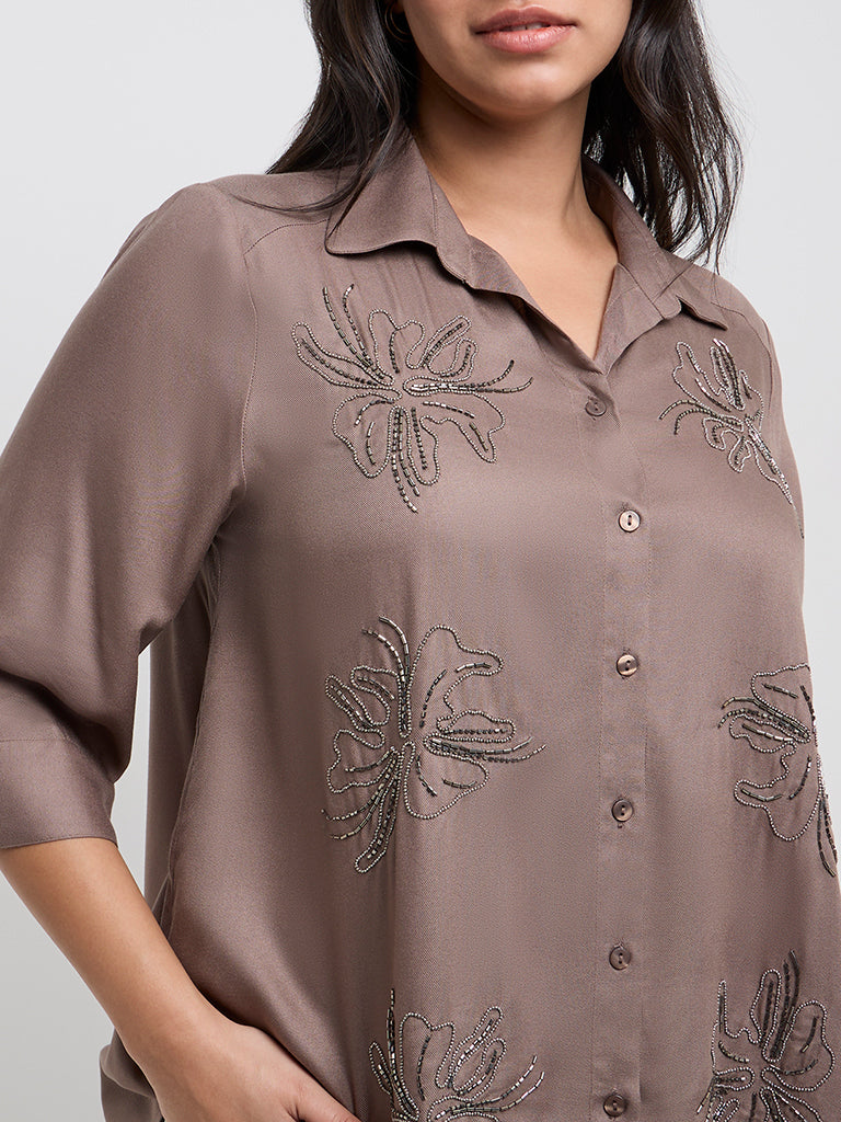 This taupe shirt by Gia is detailed with floral embellishments. Crafted with soft and breathable fabric. it boasts a notched collar. button down style and 3/4th sleeves.