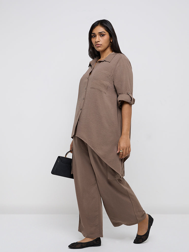 Gia presents these taupe trousers crafted from a breathable fabric. The high-rise bottom wear is engineered with a smooth elastic waistband. adjustable drawstrings and side pockets.
