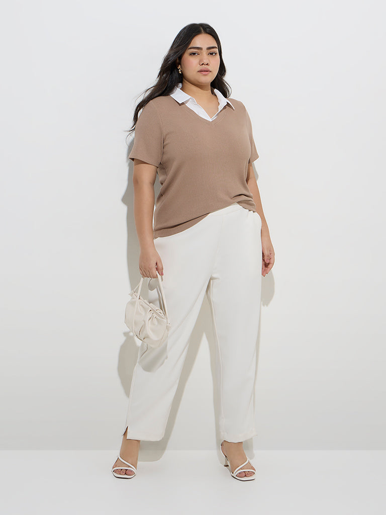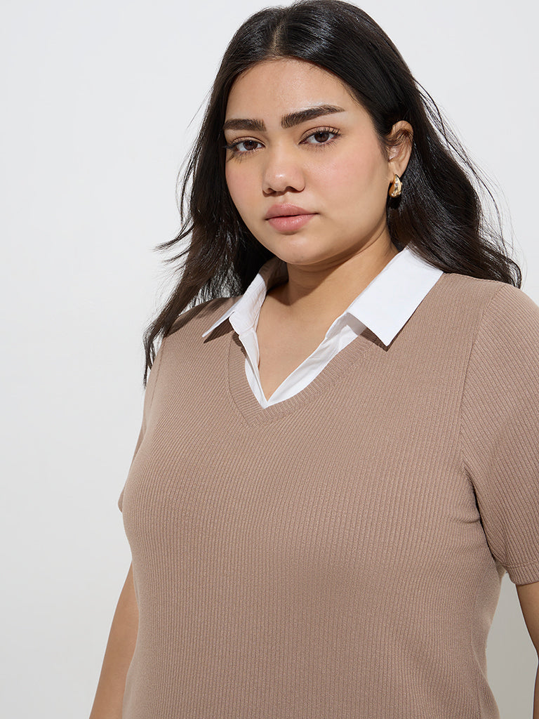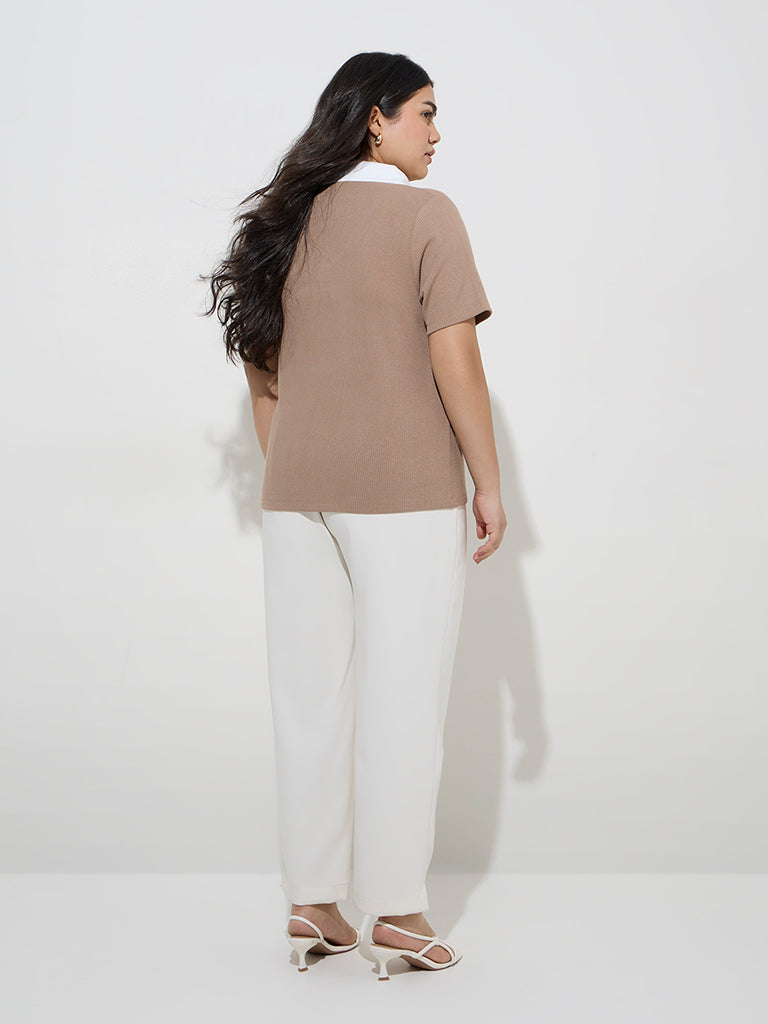 Gia Taupe Ribbed-Textured Collared T-Shirt