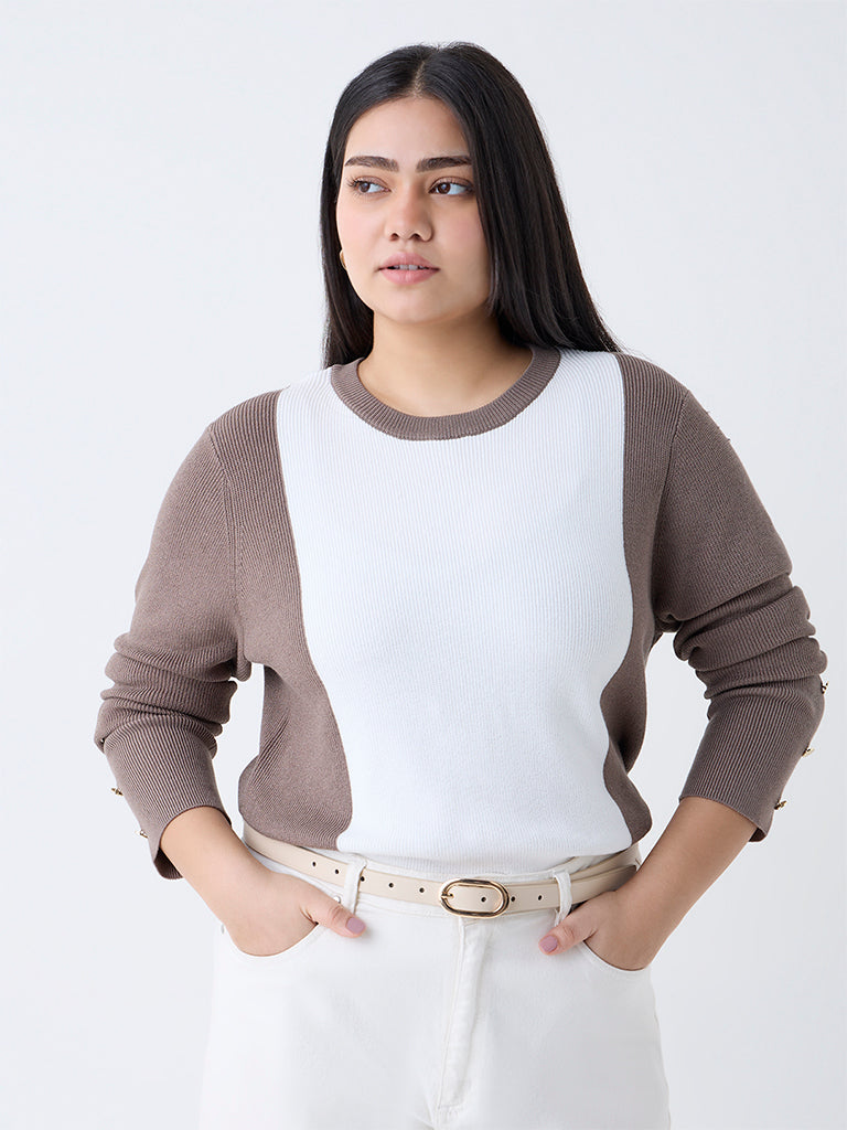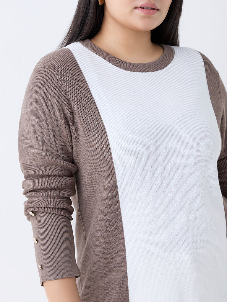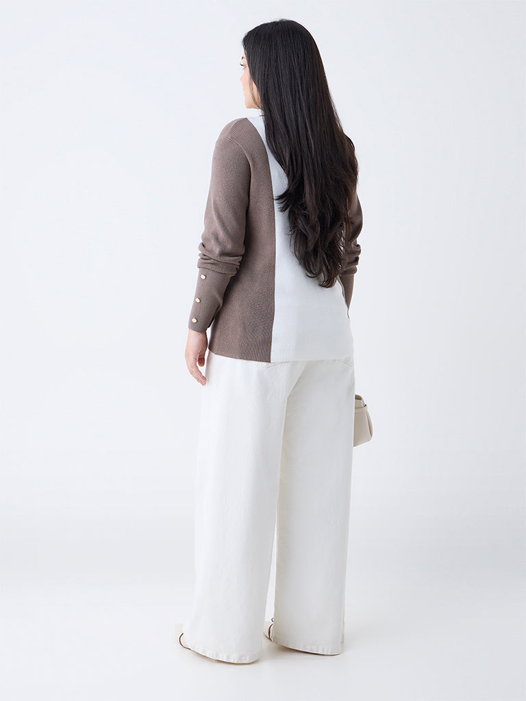 Step up your winter style with this taupe sweater from Gia. Featuring a textured ribbed finish. it’s enhanced by a striking colour block design that adds a modern edge. The round neckline and full sleeves with three-button detailing lend a chic touch. while the quality fabric ensures warmth and lasting comfort.