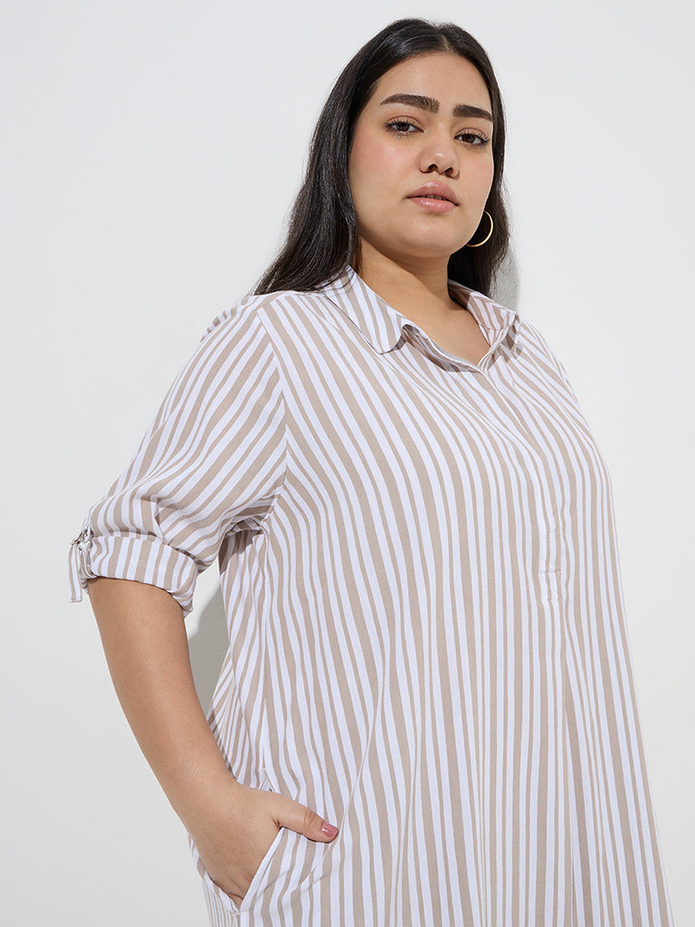 This taupe shirtdress from Gia features elegant striped motifs for a refined touch. Crafted from a rich cotton-blend fabric. it is designed with a structured spread collar and a concealed button placket for a polished look. Three-quarter sleeves and handy side pockets add both style and practicality.