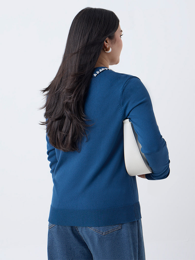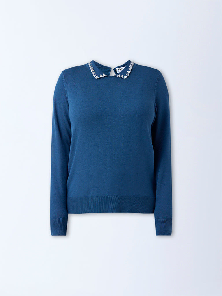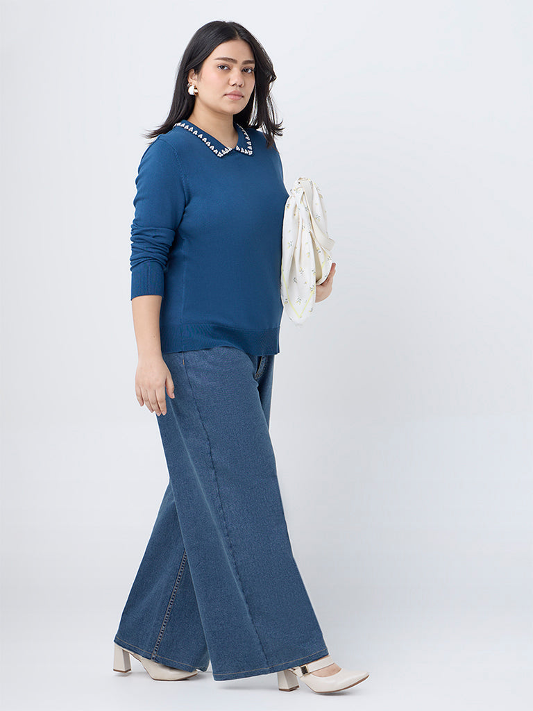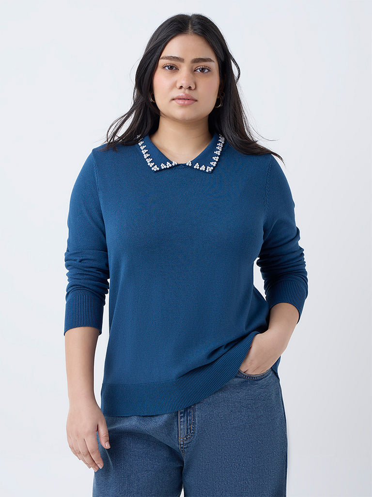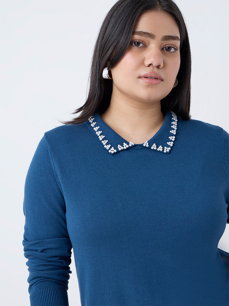 This teal top by Gia is made from a soft. stretchable fabric that ensures a comfortable fit. Highlighted with pearlescent detailing along the spread collar and finished with full sleeves. it lends a touch of sophistication to both casual and refined looks.