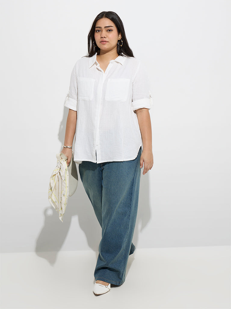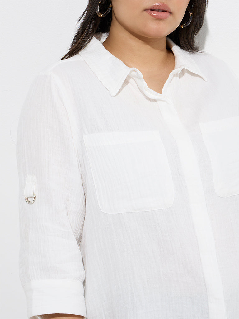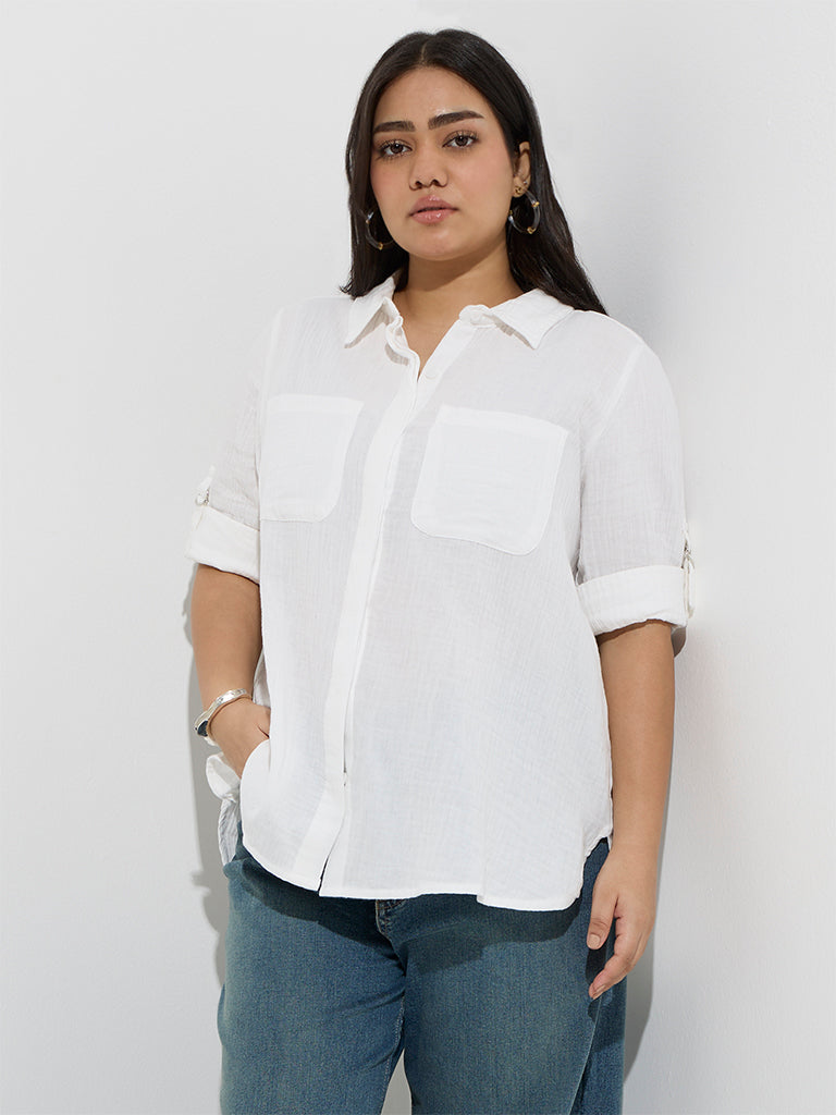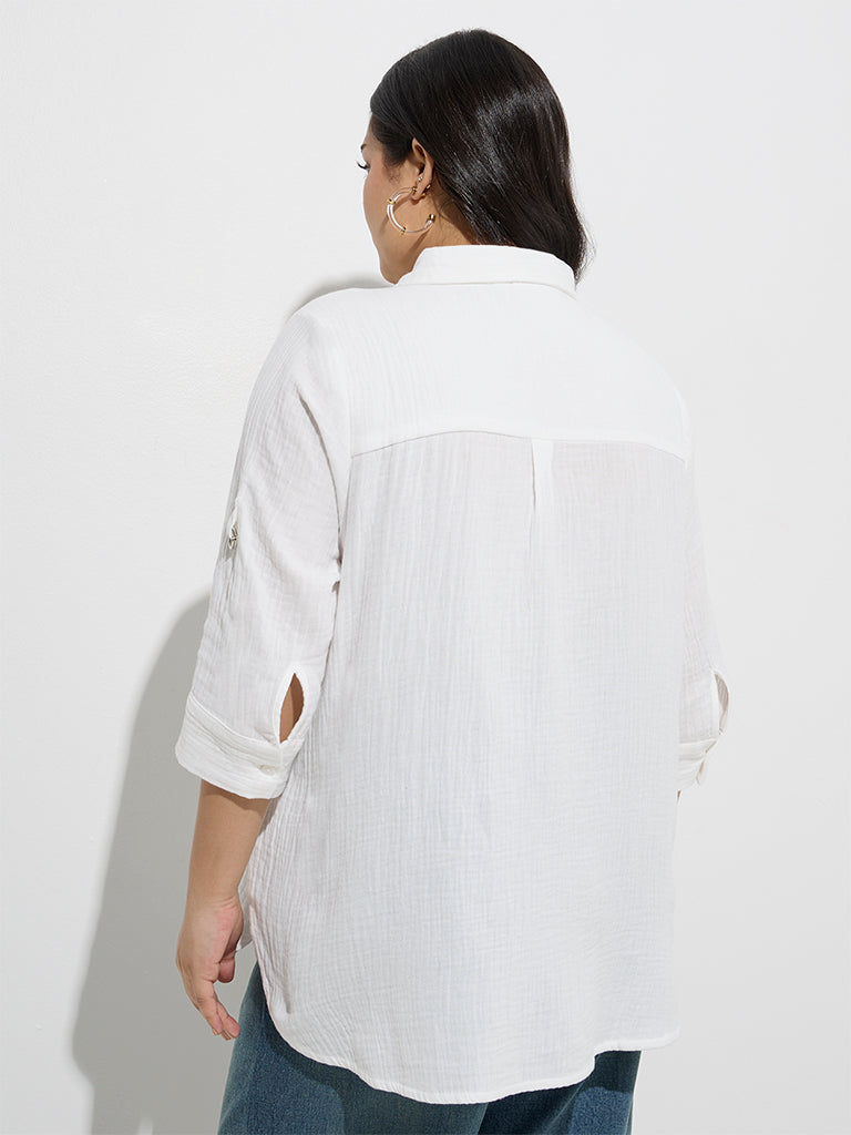 Easy and textured. this white crinkled shirt from Gia brings a laid-back charm to everyday style. Crafted from breathable pure cotton. it’s detailed with a spread collar. a short button-down front. and three-quarter sleeves for a balanced. casual look. A single front pocket adds a hint of utility to this breezy wardrobe staple.