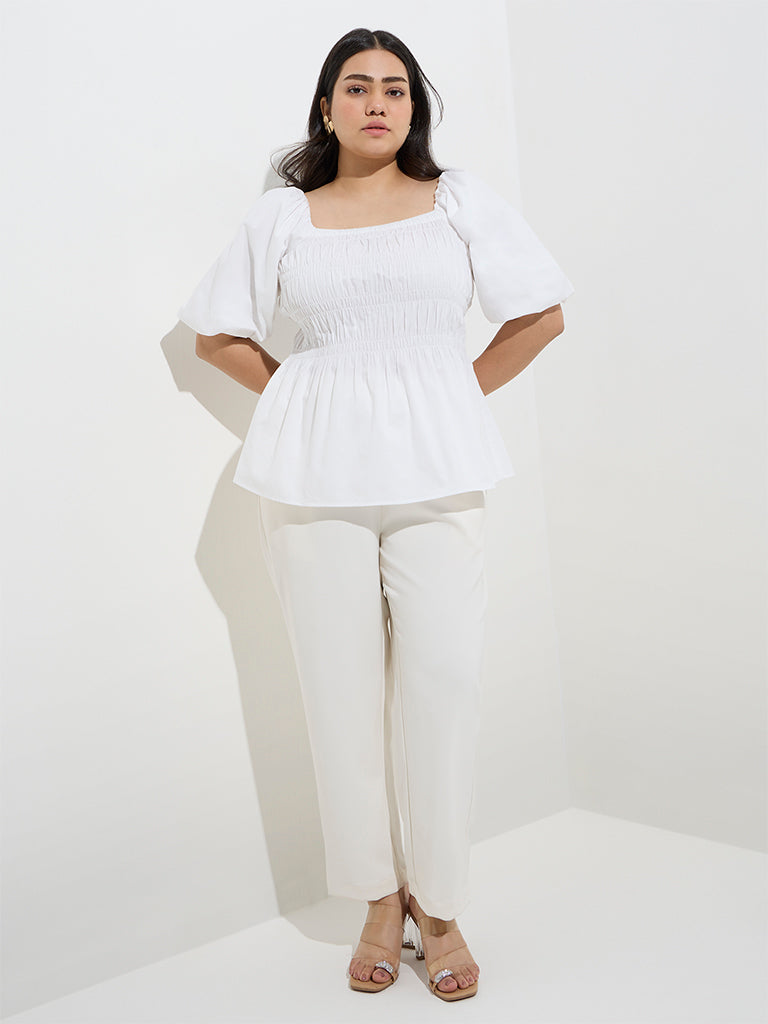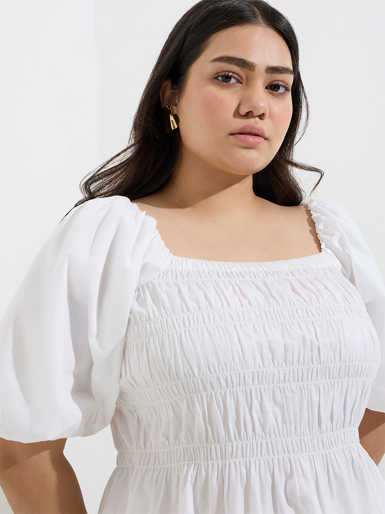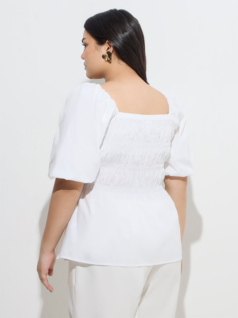 Add a touch of graceful charm to your wardrobe with this white top from Gia. Crafted from a breathable fabric. it features a flattering square neckline. a smocked bodice for a structured fit. and elegant blouson sleeves for a timeless appeal.