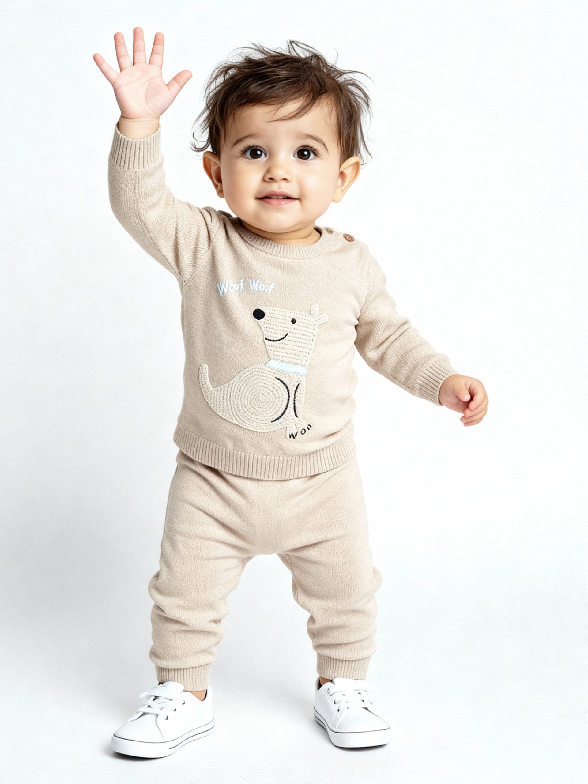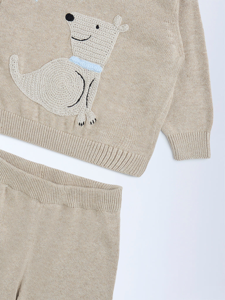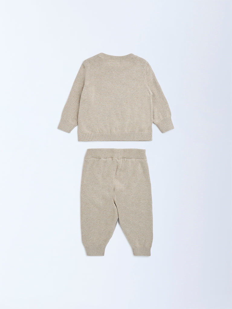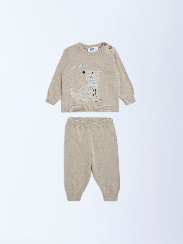 HOP Baby Beige Animal Design Cotton Sweater and Joggers Set