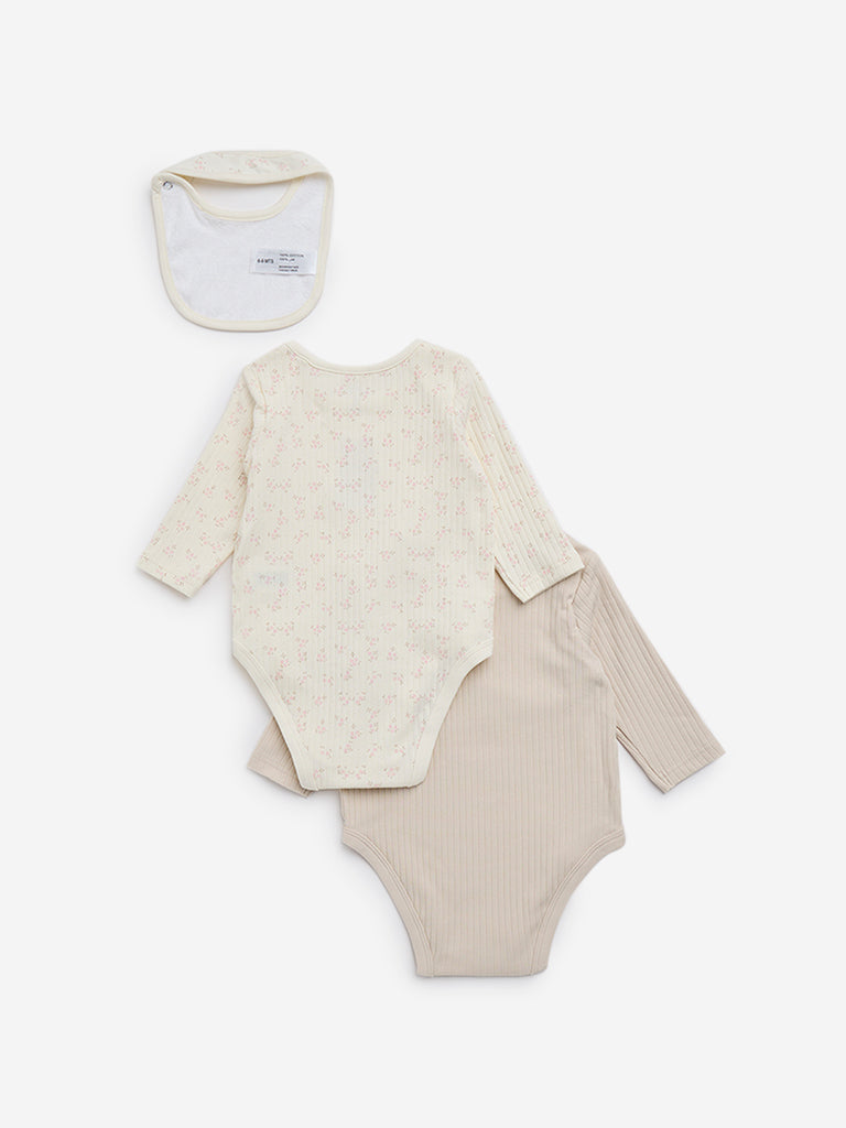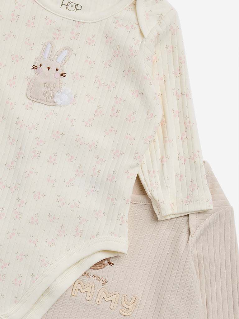 HOP Baby Beige Animal Print Cotton Rompers and Bib – Pack of 2